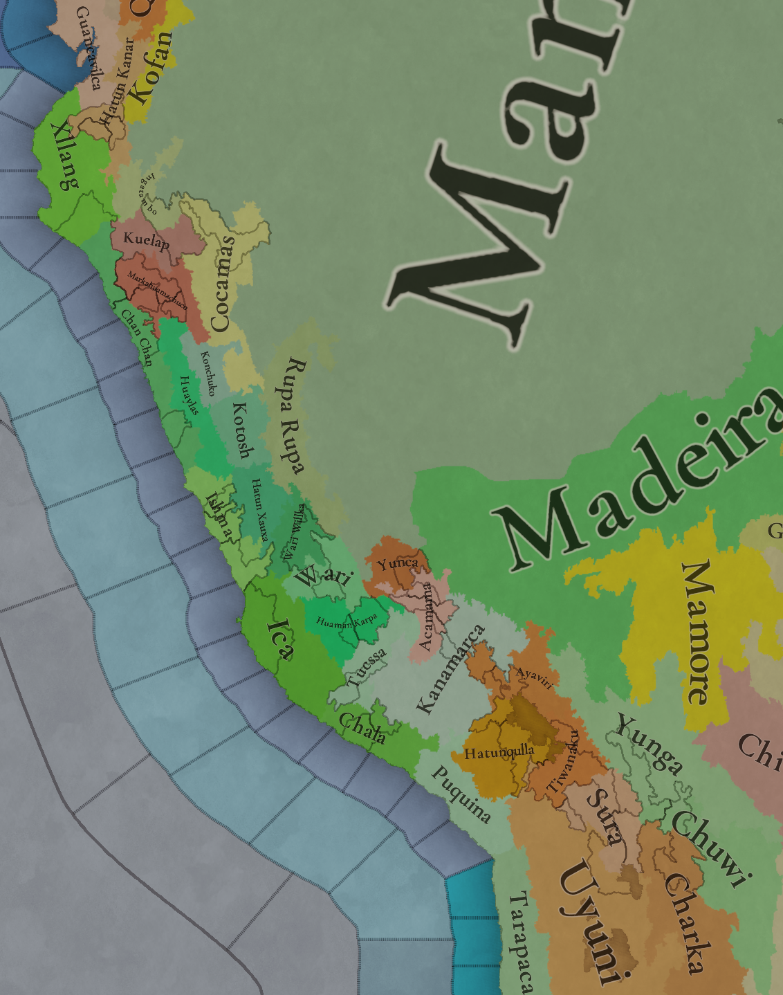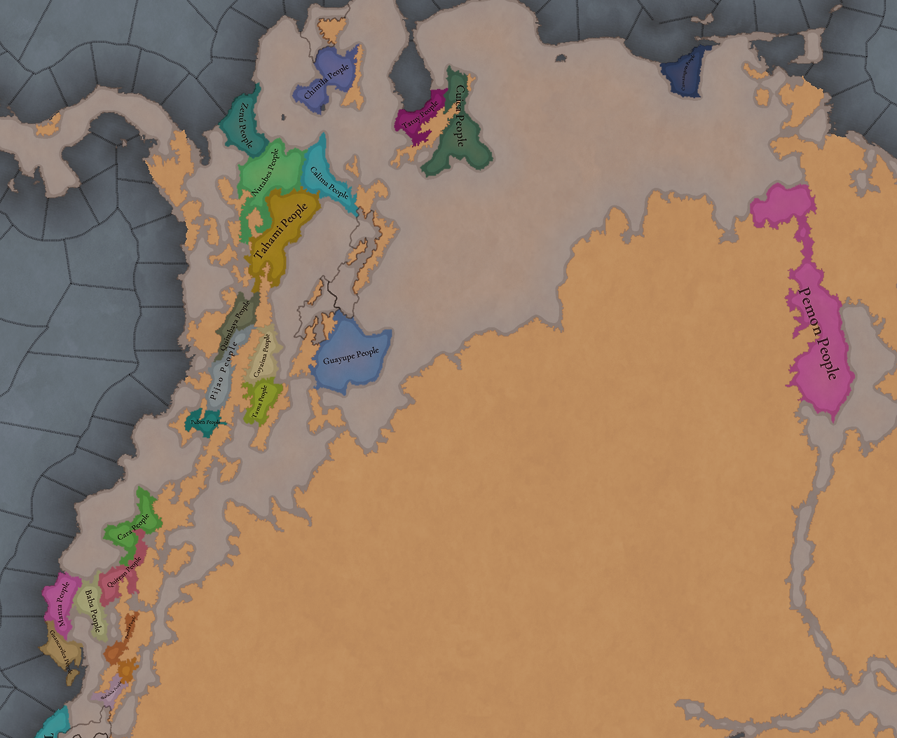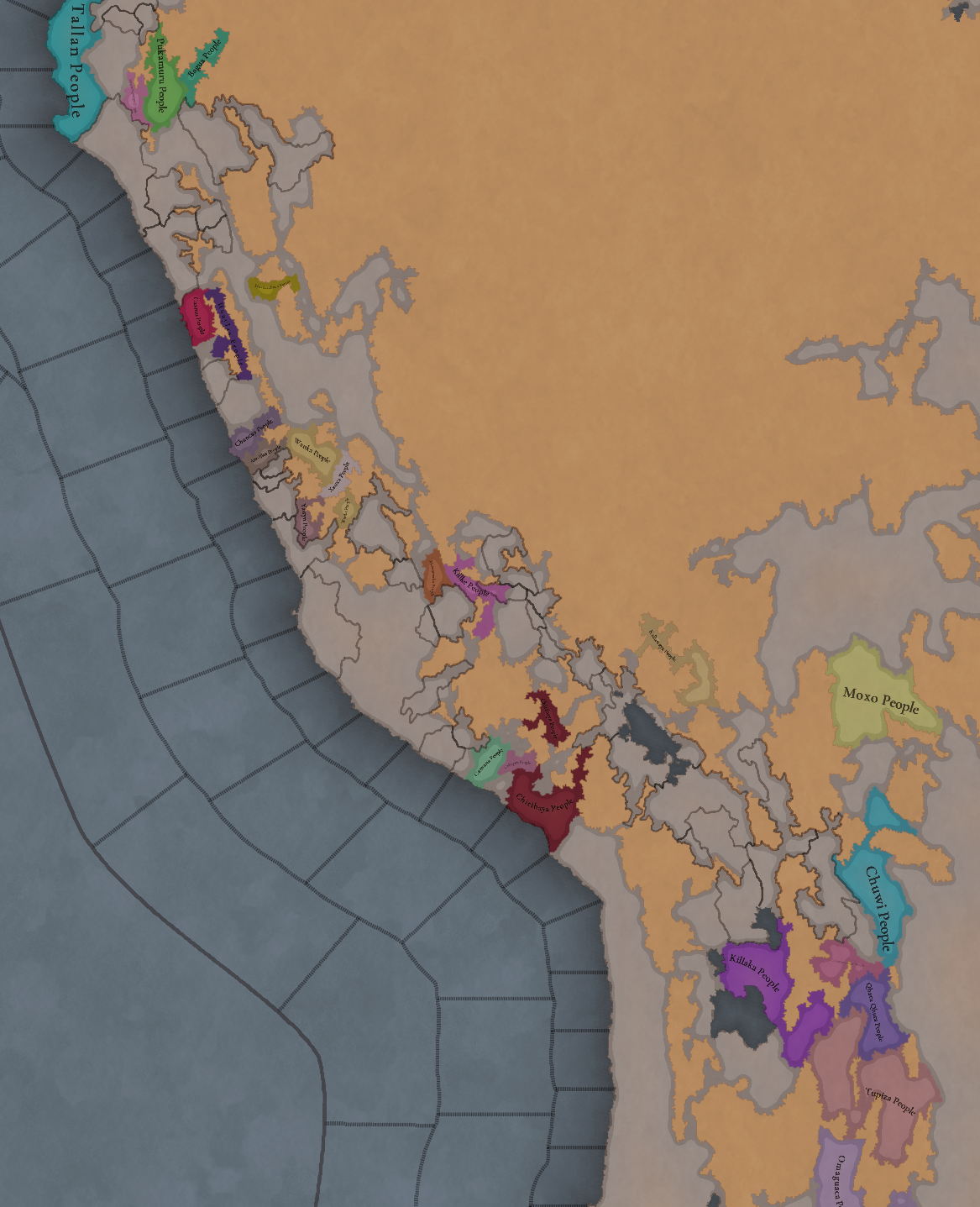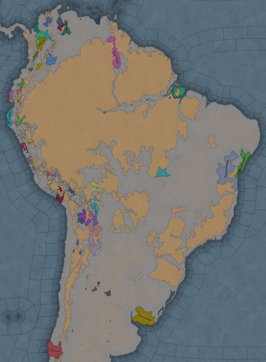 대륙 전체에 팝들의 사회가 퍼져있으며, 특히 페루에 (또다시) [팝들의 사회와 일반 국가가] 흥미롭게 섞여 있습니다. 우리는 두 가지 국가의 공존을 지도에 보기 좋게 표시하는 방법을 생각해 보고 있지만, 시간이 조금 필요합니다