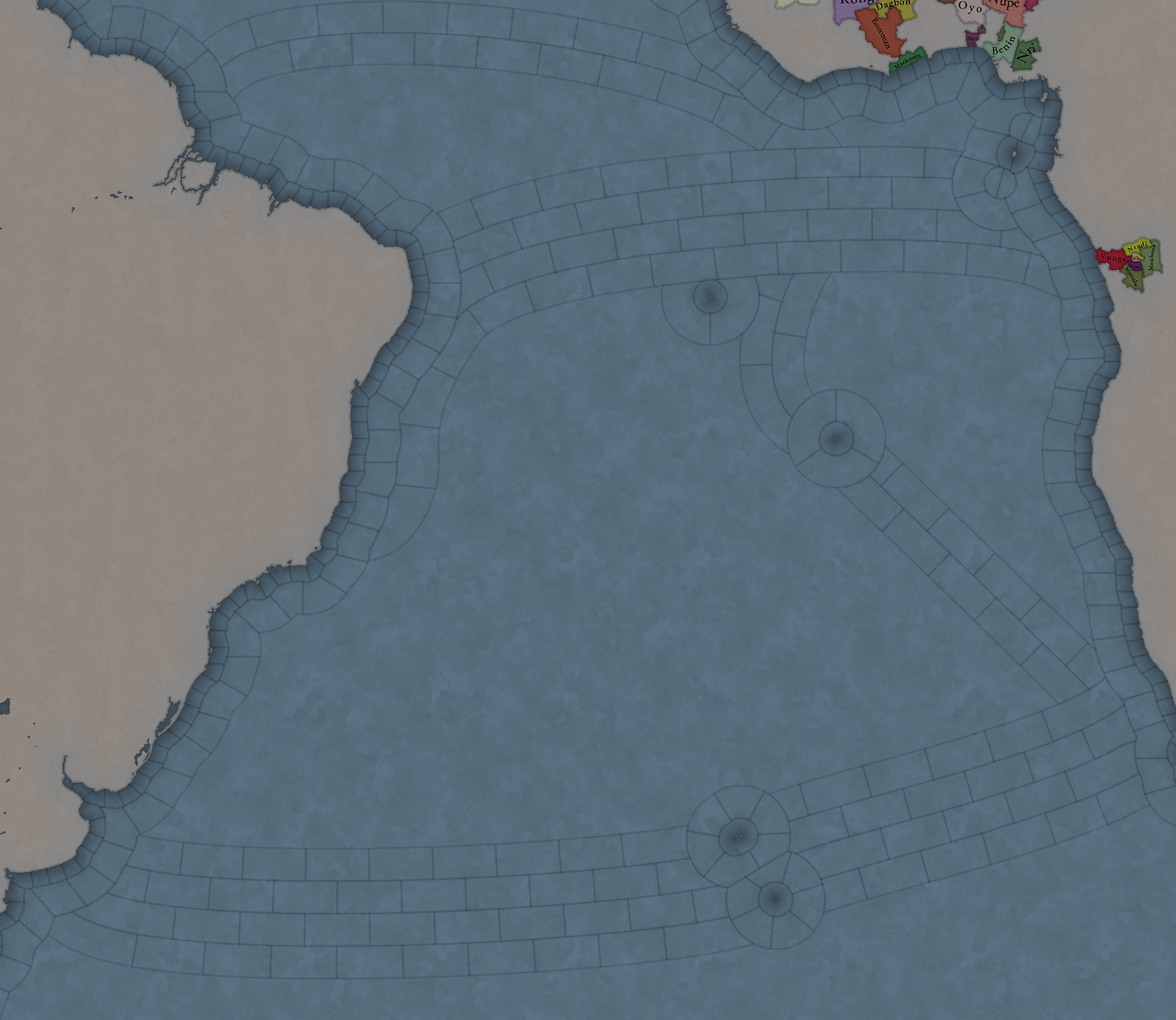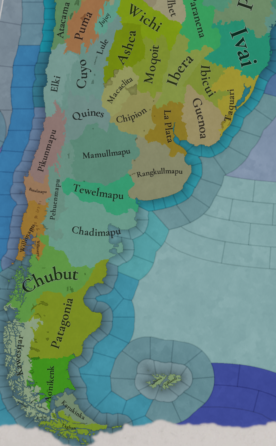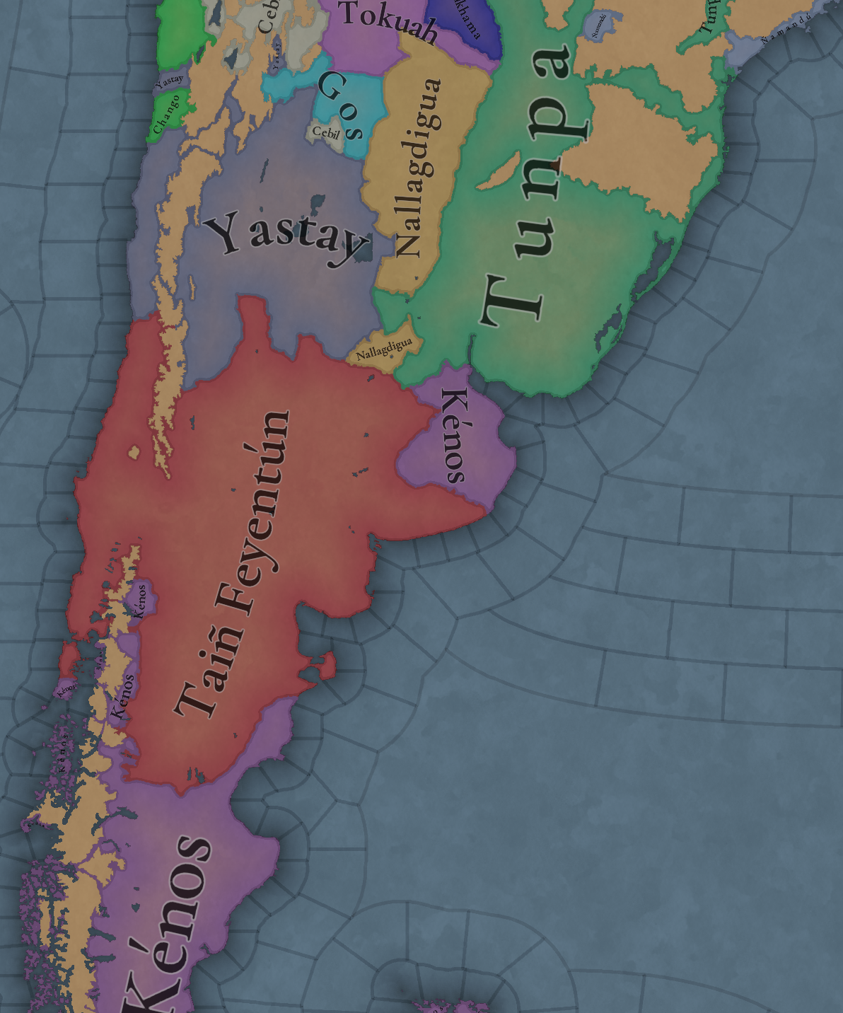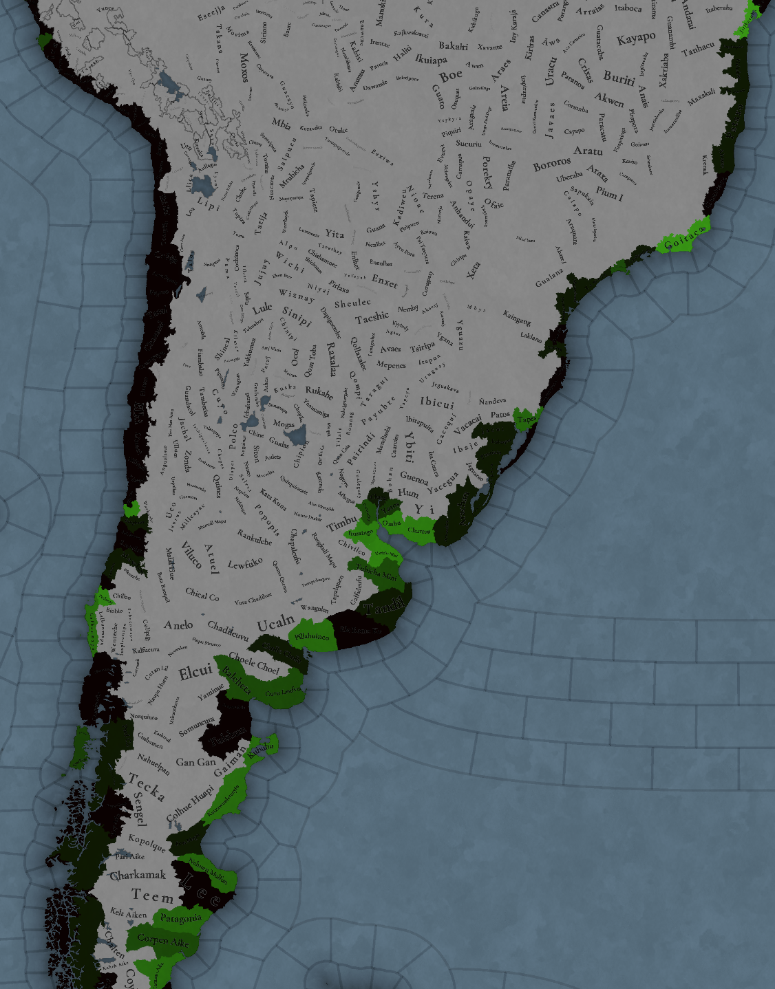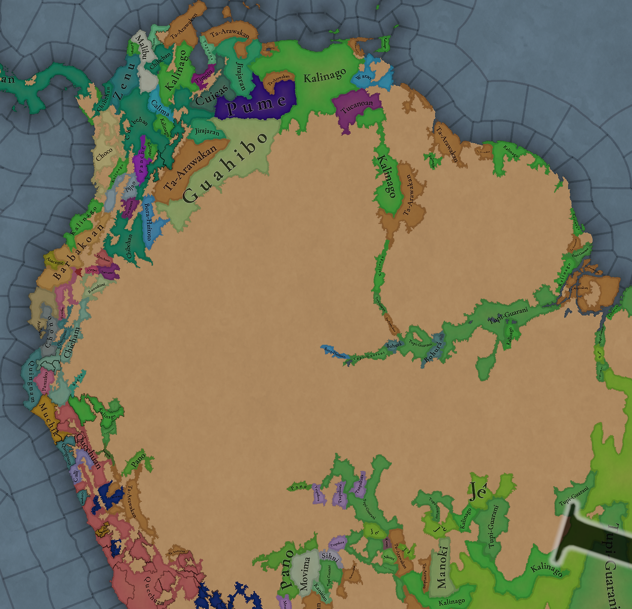 대륙 전체에 팝들의 사회가 퍼져있으며, 특히 페루에 (또다시) [팝들의 사회와 일반 국가가] 흥미롭게 섞여 있습니다. 우리는 두 가지 국가의 공존을 지도에 보기 좋게 표시하는 방법을 생각해 보고 있지만, 시간이 조금 필요합니다
