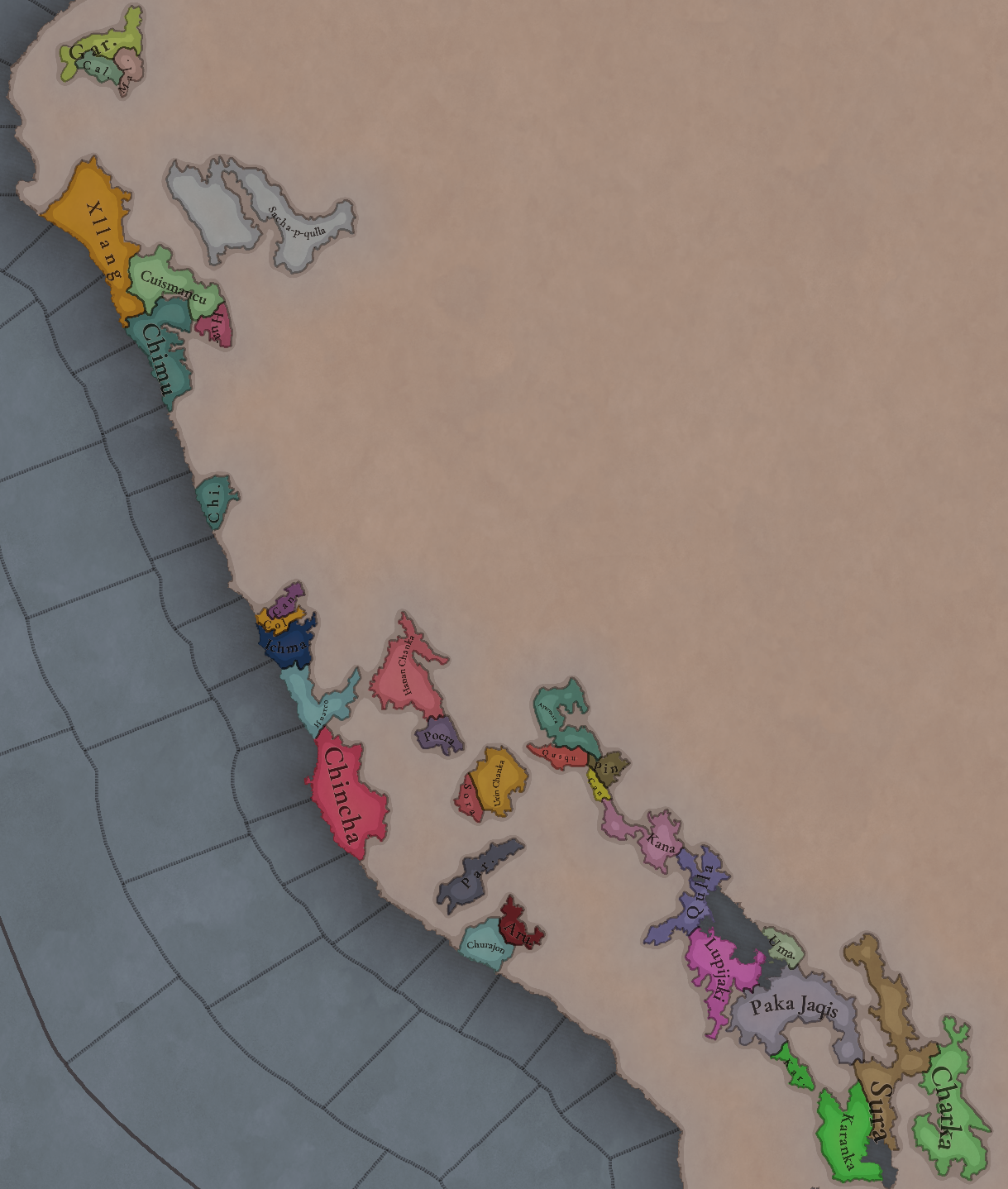 국가 수준의 국가는 대부분 현재 페루에 해당하는 곳에 위치해 있습니다. 치무나 친차와 같이 유명한 나라들도 있고, 훗날 잉카 제국을 세우게 될 작은 나라인 쿠스쿠도 볼 수 있습니다