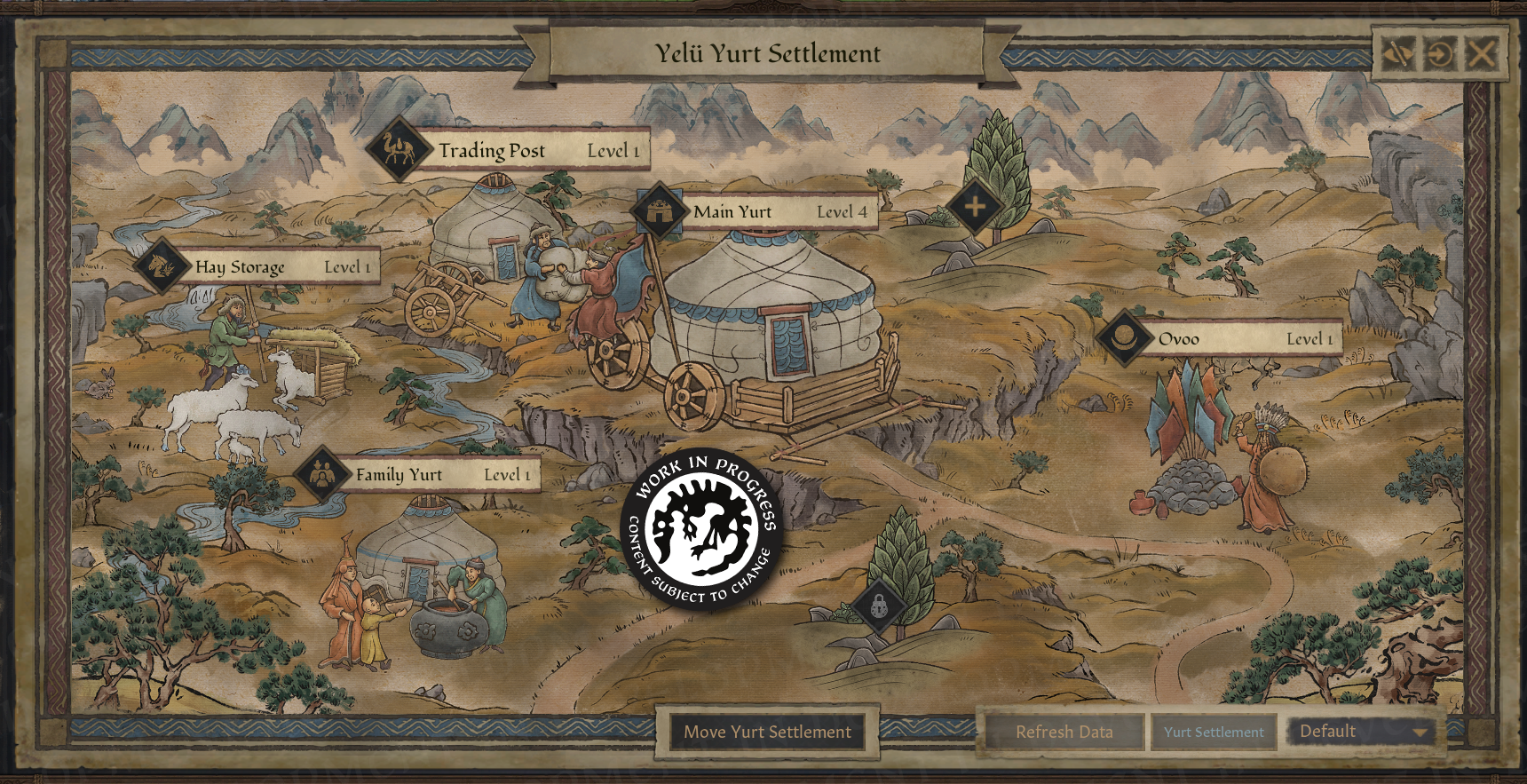 -유르트 정착지는 내부 업그레이드가 가능한 주 유르트, 그리고 초원 관리, 전쟁, 외교, 약탈 등을 업그레이드 하는 여러 전문화 건물들로 이뤄짐