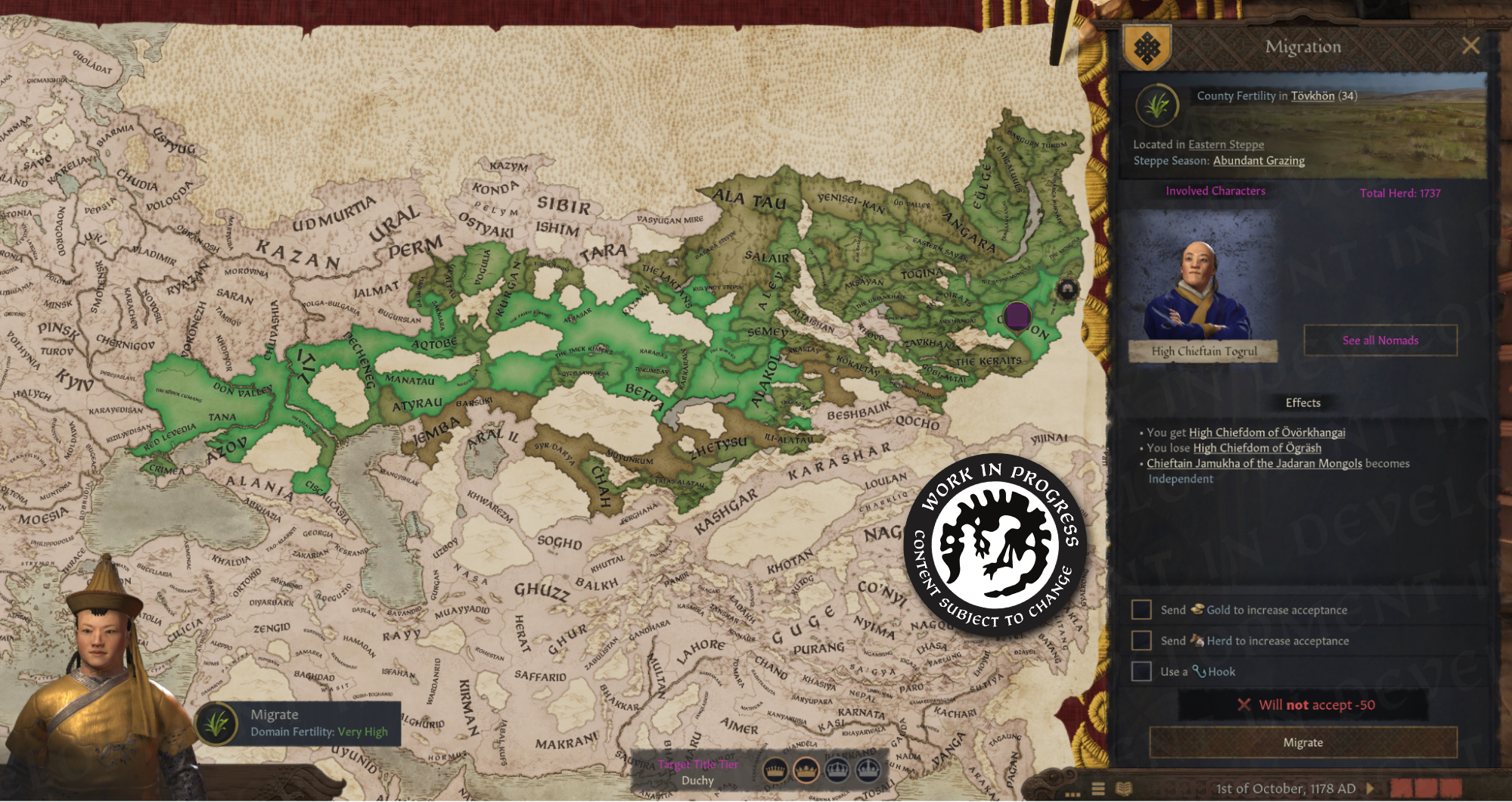 -대초원 밖에서 유목민 정부 유지가능하나, 무리를 키울 수 없음. 성 영지 보유 가능하나 건물 건설 불가. 현지 정부 유형으로 전환 가능한 결단 얻게 됨