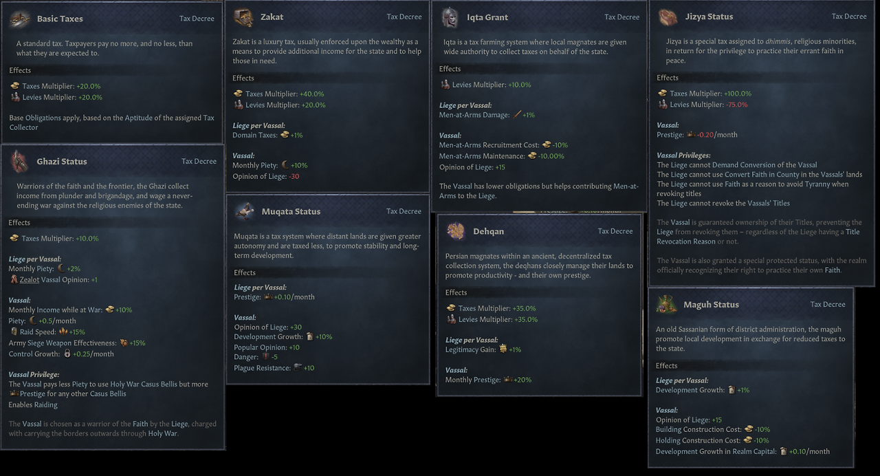-모든 조세 칙령 업데이트: 효과 변경 뿐만 아니라 정통성, 위험, 역병 저항성, 가지 습격 등 이후 새로 추가된 시스템도 적용됨