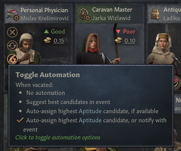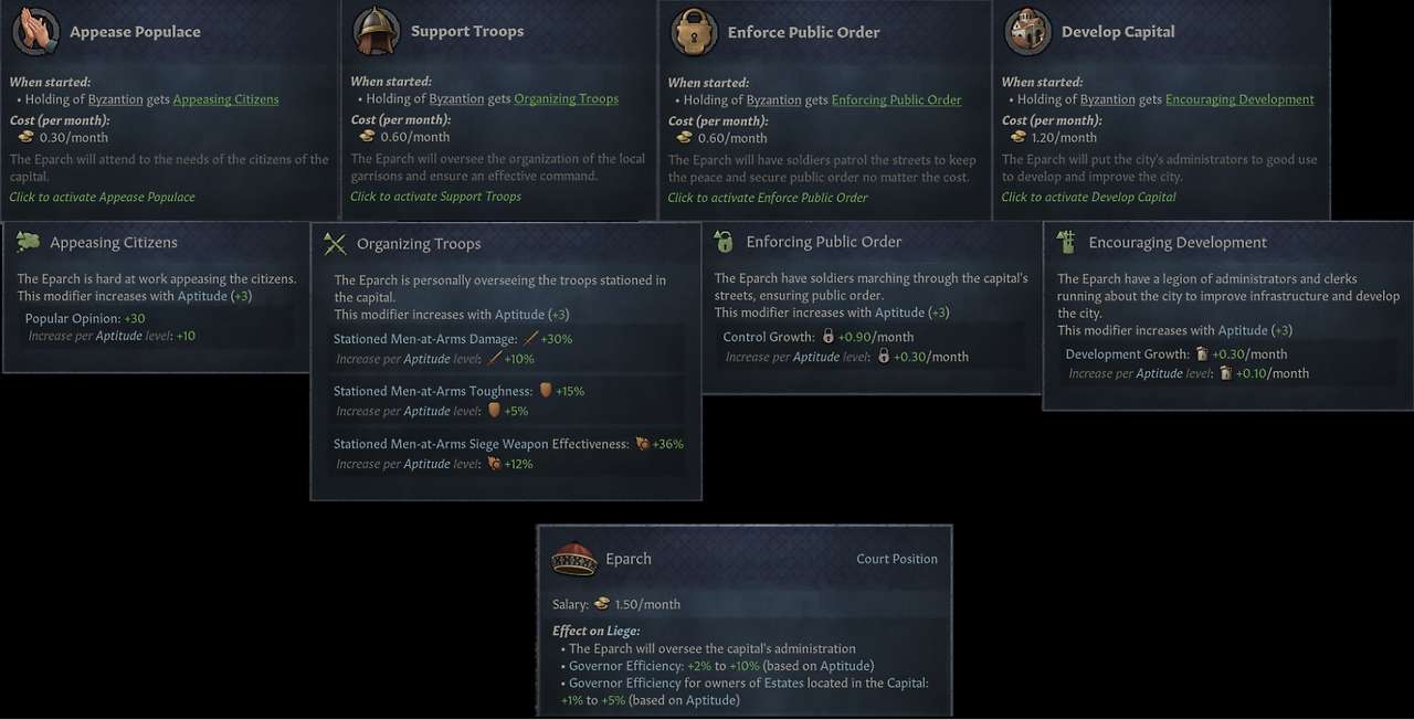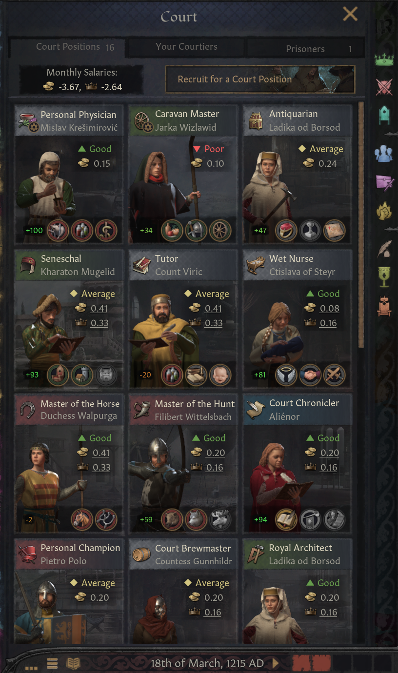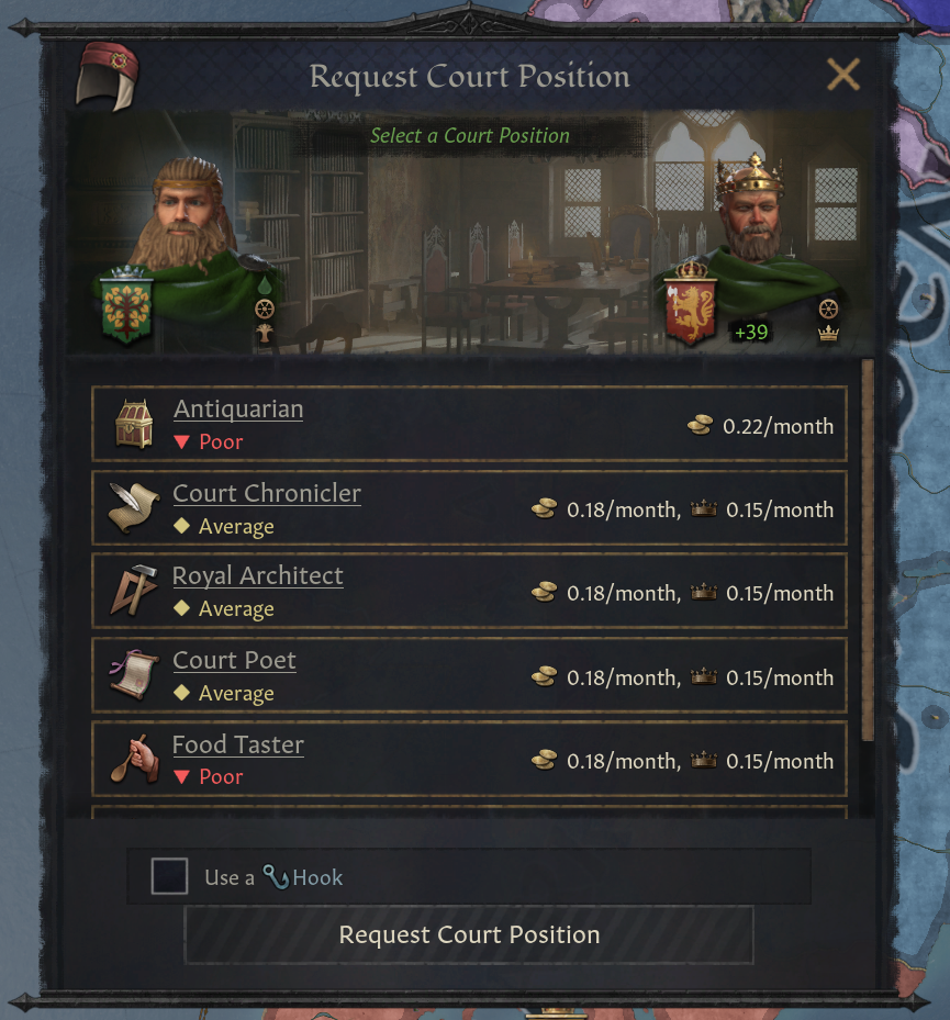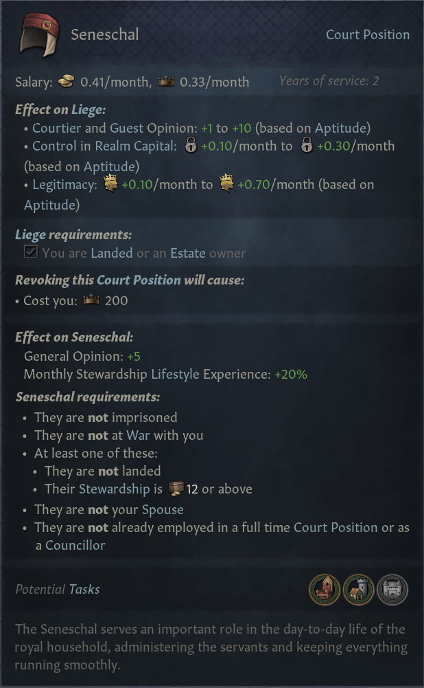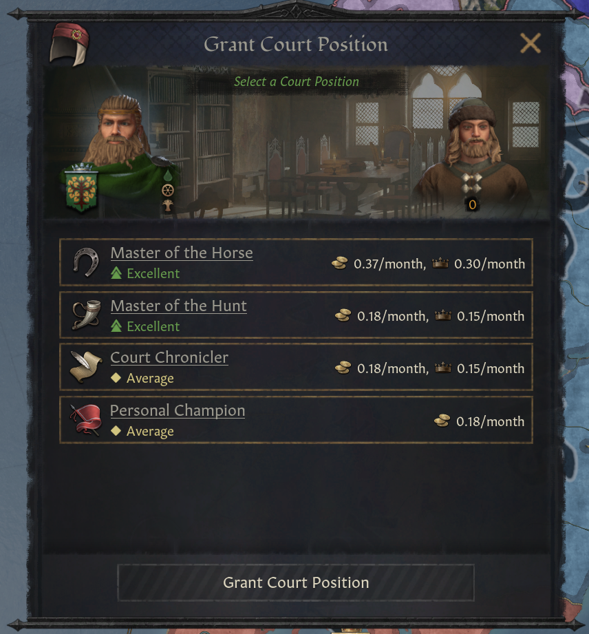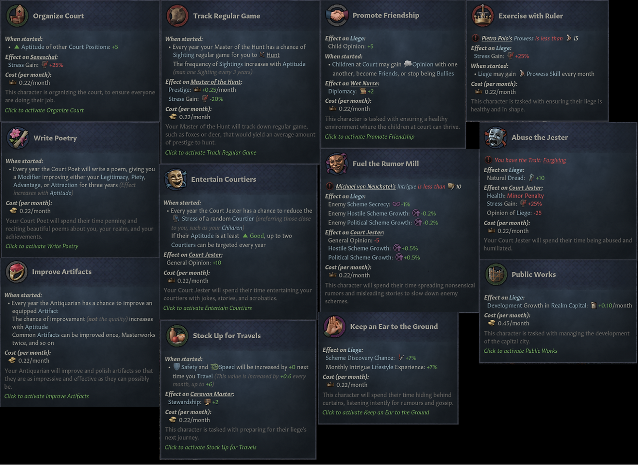 -대부분의 궁정 직위는 해당 직위를 가진 인물에게 흥미로운 효과 제공: 인생관 경험치 +20% 등