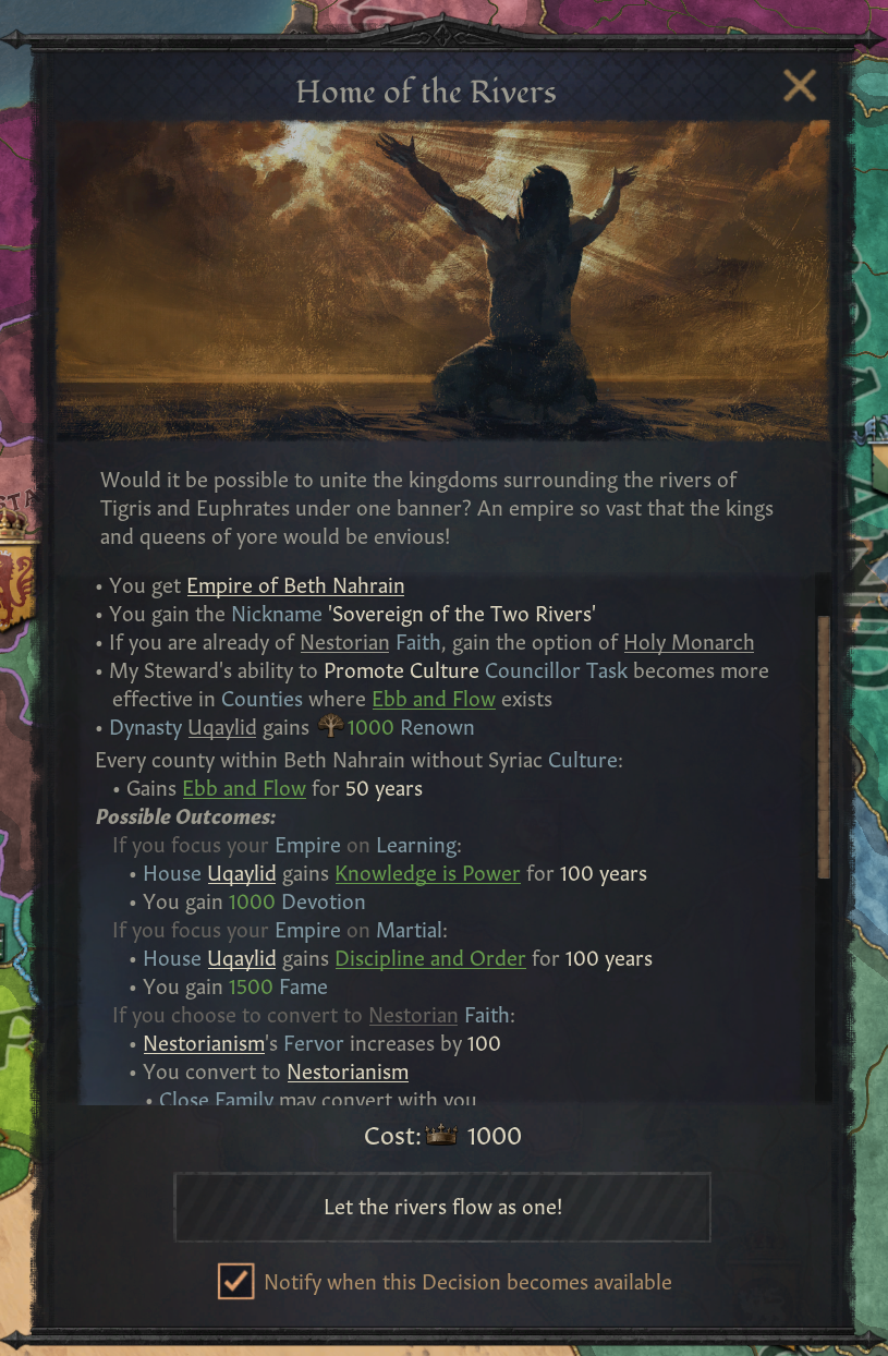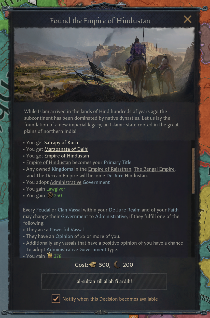 -이슬람용 힌두스탄 제국 생성 결단 추가: 인도 북부 충분한 지역 확보 시, 델리나 라호르로 수도 옮기고 보유하고 있는 3개의 인도 제국을 합쳐 새로운 제국 생성. 권력의 길 DLC 보유 시, 행정 정부 획득 - 선거 투표 대신 세속 계승