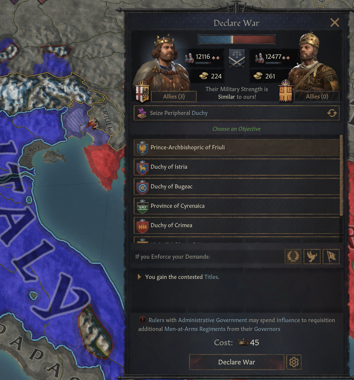 -제국의 관습 권역 밖에 위치한 공작령을 매우 저렴한 위신 비용으로 공격 가능: 공격자는 공성전과 전투 전쟁 점수를 3배로 얻어, 빠르게 점수를 채울 수 있음