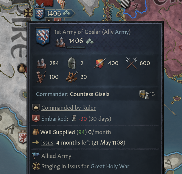-이를 통해, 보급을 찾는다고 AI가 끝없이 병력을 이동시키는 것을 막고 십자군을 더 성공시킬 수 있도록 만들며, 항해 지양을 통해 육로로 이동해 -30 유리함 페널티를 피하도록 만듦
