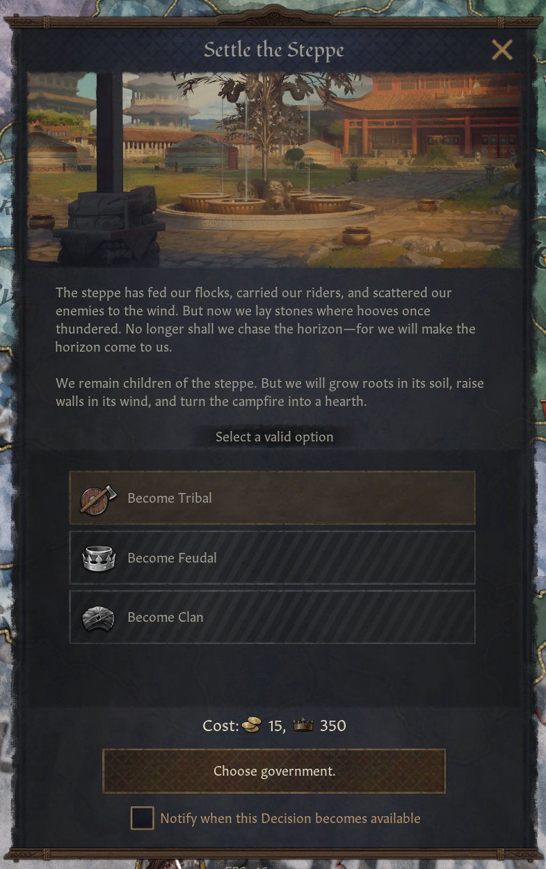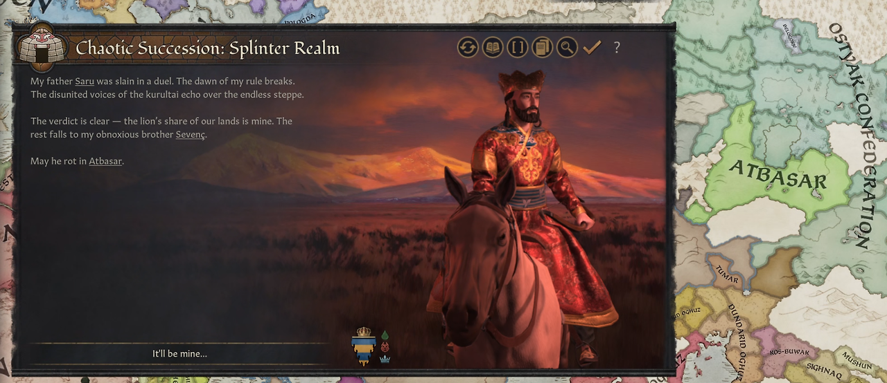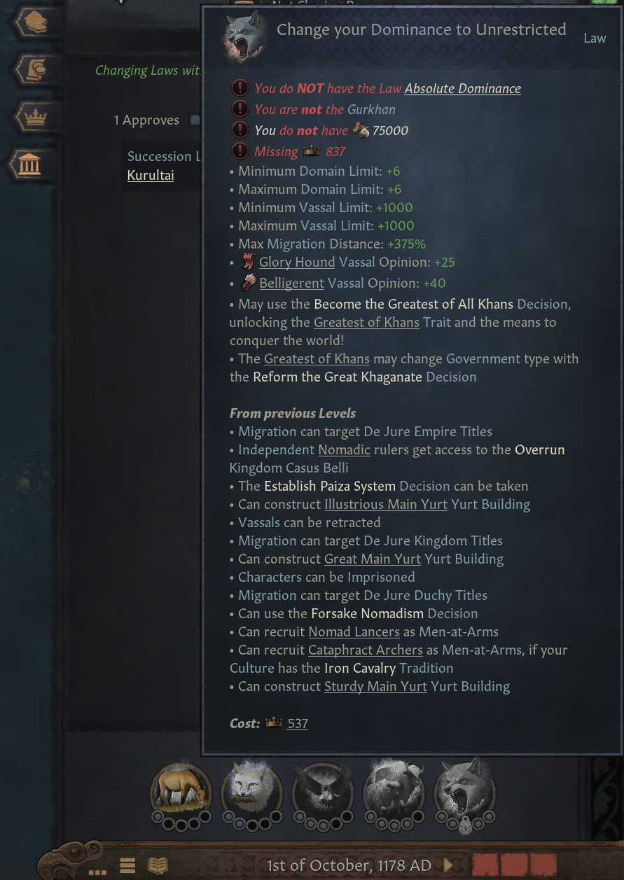 -이 단계에서, 구르칸은 가장 위대한 칸되기 결단 채택 가능 (이후 일지에서 다룰 예정). 가장 위대한 칸은 세계를 정복하고 대초원에서 나오지 않고도 정부 유형을 바꿀 수 있게 해줌