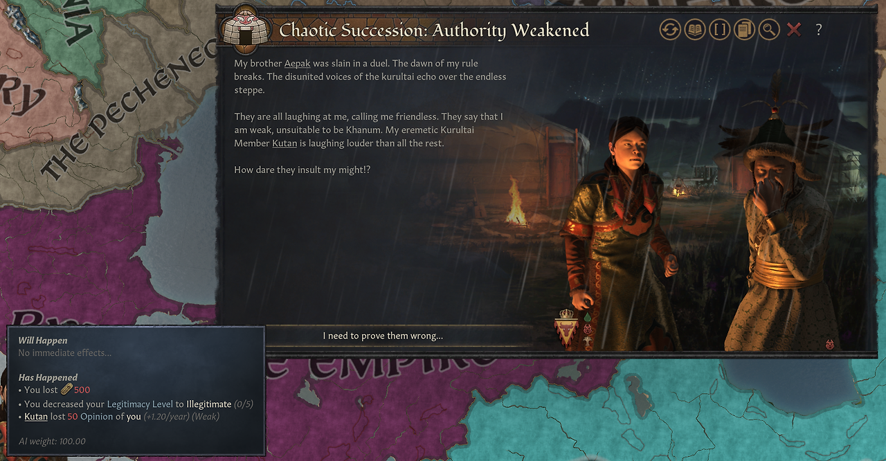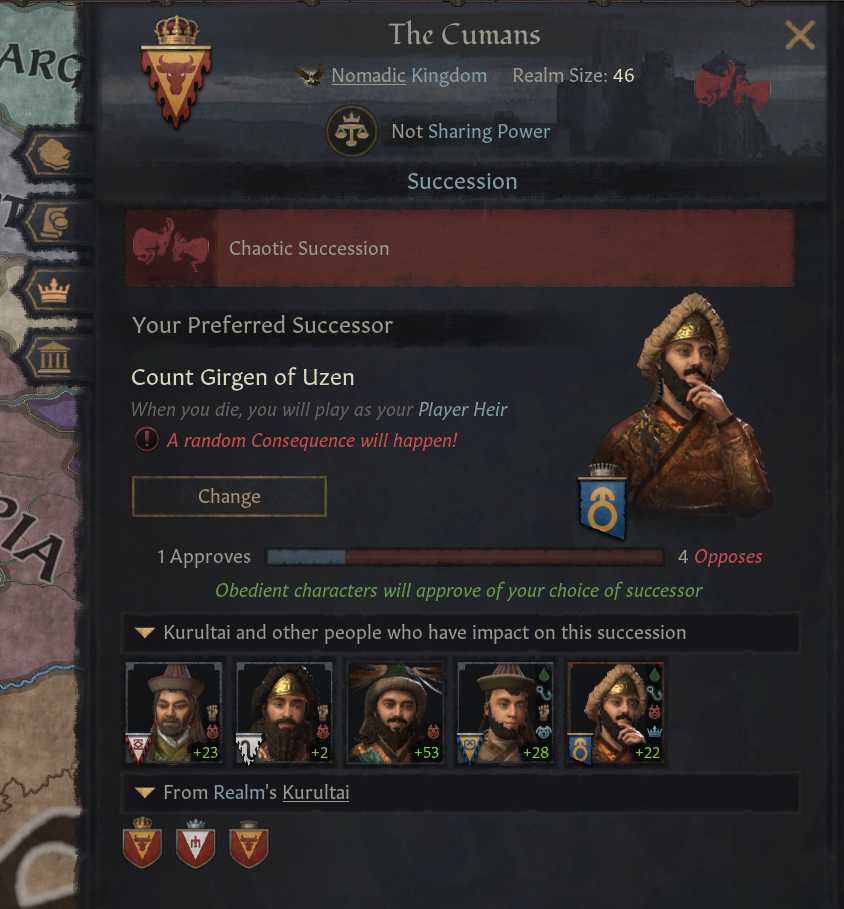 -1명 이상의 쿠룰타이 일원이 복종하지 않을 경우, 혼란스러운 계승이 이뤄짐. 결과는 예측 불가: 정통성/위신 감소부터, 봉신 일원이 당신의 무리를 강탈하거나, 대몽골 제국의 분할과 같은 결과까지로 구성됨