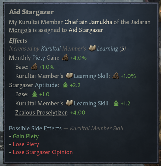 -열성적인 표고: 개종 장려 수용도 증가, 점성가 도움주기 쿠룰타이 업무로 얻는 신앙심 +10%