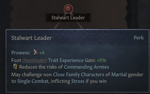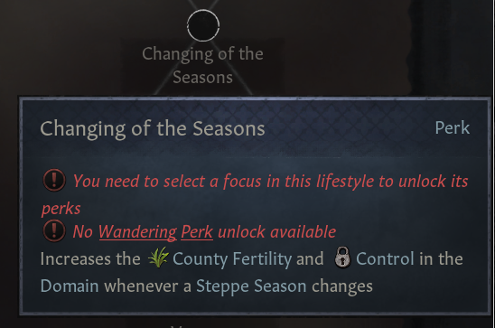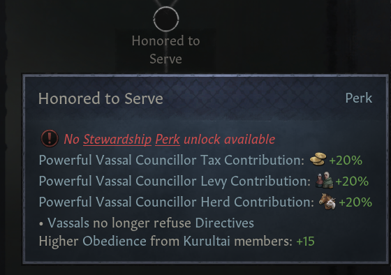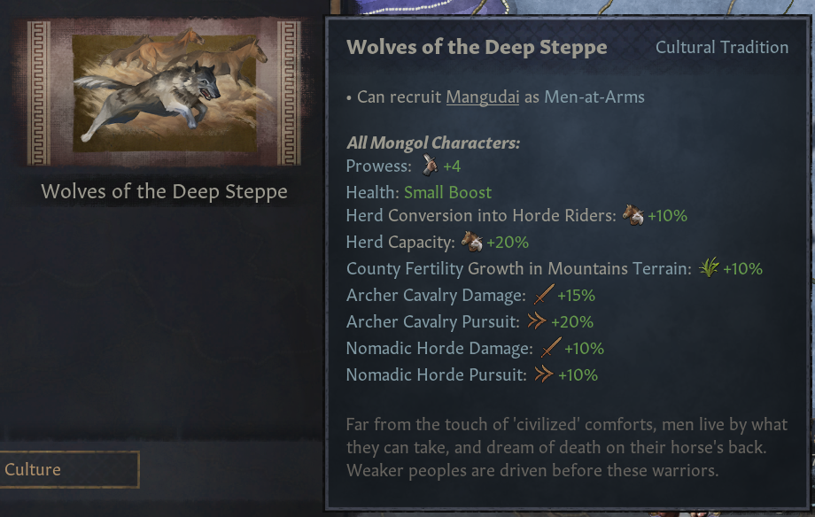 (1) 풍족한 방목: 권역 내 모든 백작령에 비옥도 증가 +25% 제공. 통치자들은 일반적으로 행복하며, 봉신 의견 증가, 무리 요구 상호작용에서 더 많은 무리 획득. 무장병 유지비 -20%. 사냥 주최 -50%
