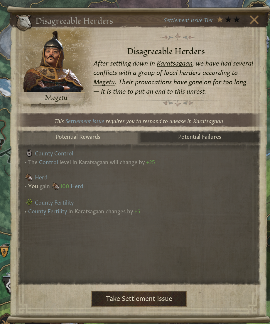 (3) 심각한 가뭄: 나쁜 계절 1. 비옥도 소모 20%. 평화로운 이주 시 궁정신하 의견 증가. 이 시기 평화로운 이주 수용율 증가. 대초원 내 정복 전쟁 명분은 위신 제공. 무리 획득 및 기수로 전환 느려짐