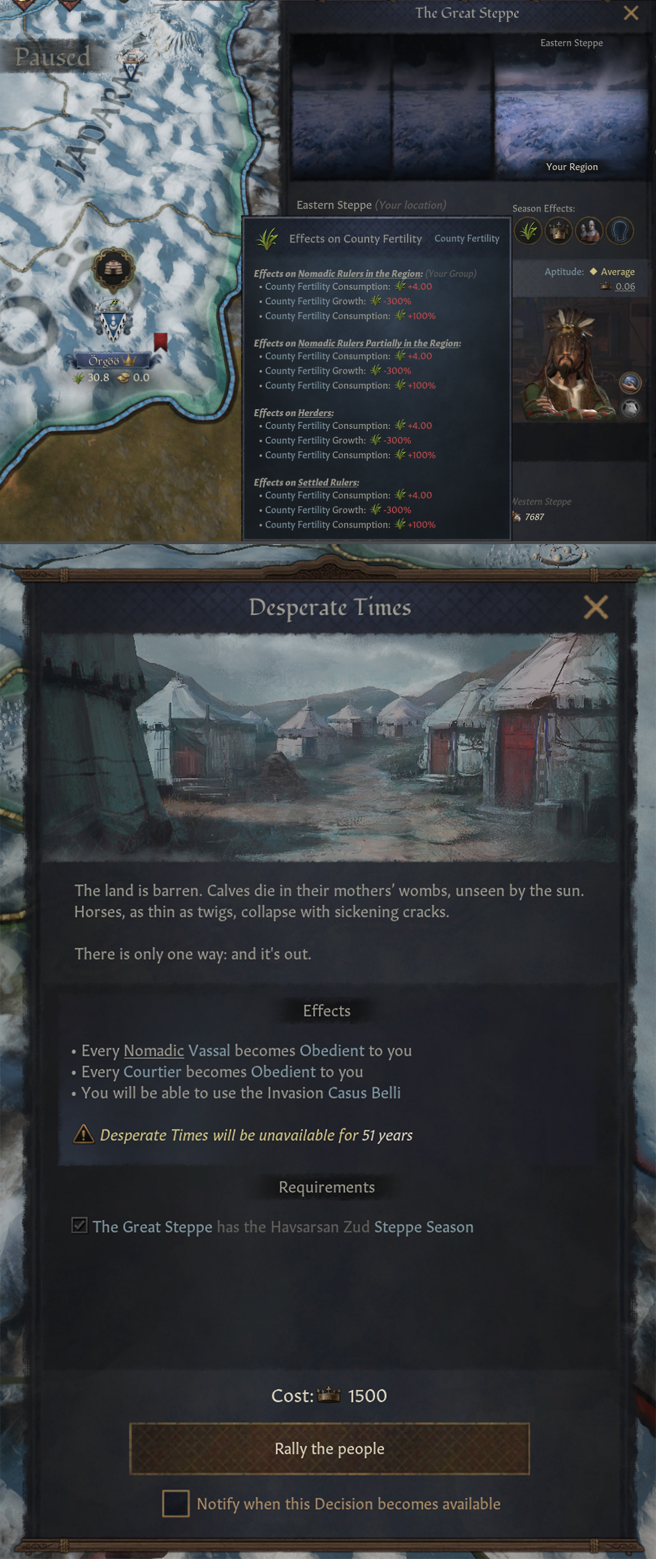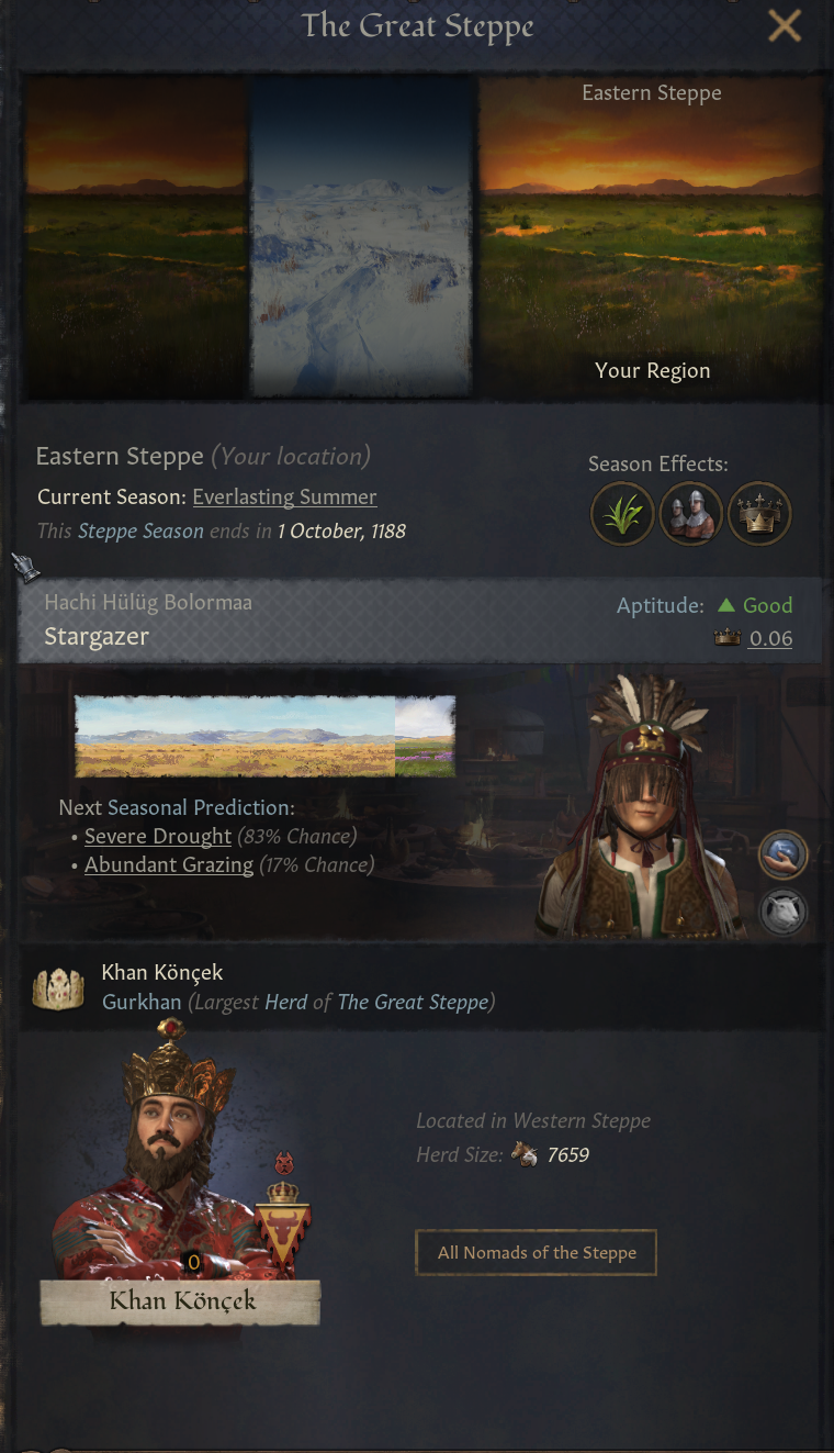 (7) 합살산 조드: 2개 이상의 자연 재해 조합. 심각한 나쁜 계절로 방목지 찾는게 불가능. 백작령 비옥도 없어짐. 선택지가 없어지지는 않음 - 조공국 수용율 증가. 절박한 시기 결단 사용 가능 = 위신을 소모해 모든 인물 복종 상태로 만들 수 있음. 대초원 외로 나갈 수 있도록 침공 전쟁 명분 해금. 보복 & 굴욕주기(더 높은 지배력 유목민 대상) 전쟁 명분 무료, 스트레스 획득 +30%. 유일한 방법은 탈출이란 것을 알게 됨