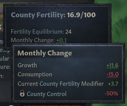 -평형치: 시간이 지남에 따라, 백작령 비옥도가 도달할 것으로 예측되는 수치 = 비옥도 성장과 소모 합친 수치이며 지형 유형, 계절, 쿠룰타이, 학식 능력치에 영향받음