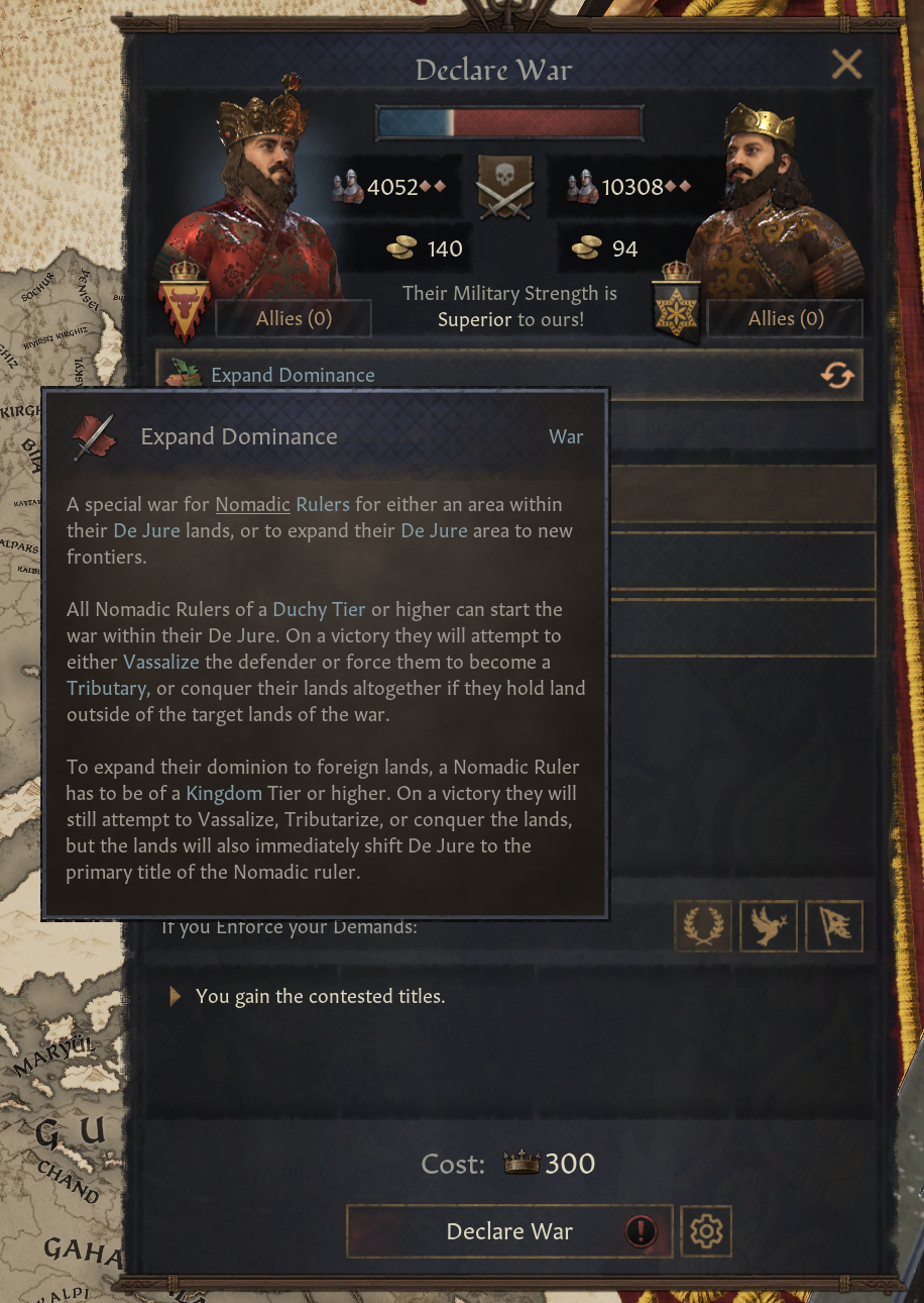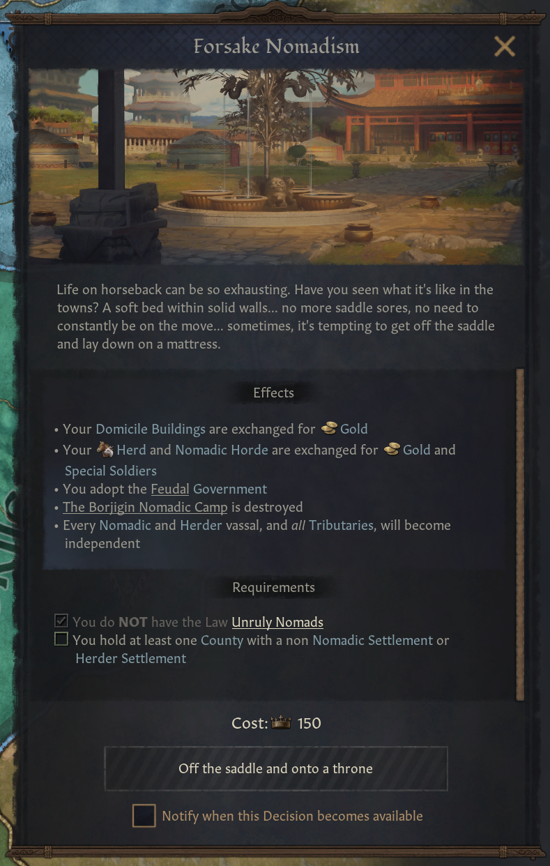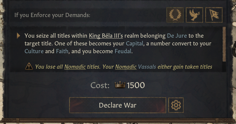 -왕국 침략 전쟁 명분: 유목정을 그만둘 수 있는 다른 1가지 방법. 아무 정착 왕국을 대상으로 사용 가능, 승리 시 목표 작위를 공격자에게 제공하며, 봉건/씨족/부족제로 전환함