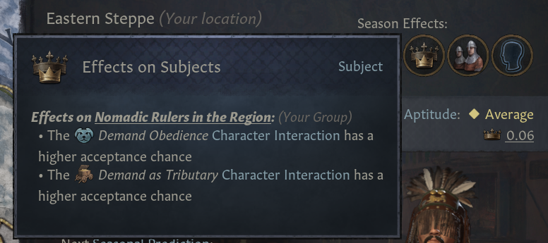 -조공국, 연맹 수용도, 무리 획득, 조공국 의견에도 영향끼침. 전쟁 명분 비용, 작위 생성 비용 변동치 제거 - 유목민은 계절에서 전쟁 명분 비용 할인을 얻고, 작위는 생성이 아닌 지배 결단으로 얻게 됨