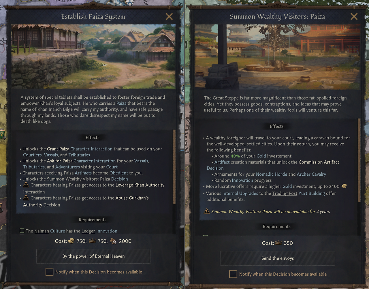 -파이자 제도: 대칸의 신뢰의 상징. 충성스러운 상인에게 대초원에서의 안전한 이동을 보장하기 위해 제공됨. 파이자 제공 시 해당 인물을 복종하게 만들며, 부유한 방문객 초청 결단 사용 가능. 해당 결단에서 금을 투자해 특별한 유물을 얻거나, 더 많은 금을 얻거나, 군단을 강화하거나 무작위 혁신 진행도 획득