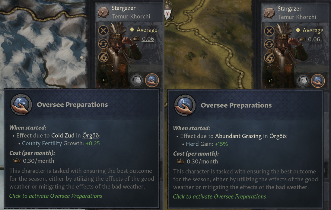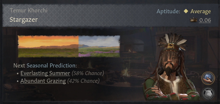 (8) 창천의 축복: 매우 좋은 계절, 비옥도 +300%, 보급한계 +100%, 속령 의견 증가, 스트레스 획득 -25%. 몽골이 대초원 밖으로 나온 원인 하나가 계절 변화였던 것을 반영해, 몽골의 중국/유럽 침략 이후 이 계절이 발생할 가능성 높음. 전체 게임에서 단 1번만 발생하며, 게임 시작 이후 매 100년마다 발생률 높아짐. 기존 계절이 10년 지속됐는지에 관계 없이 이 계절은 발생 시 바로 전환되며 다른 권역으로 전파됨