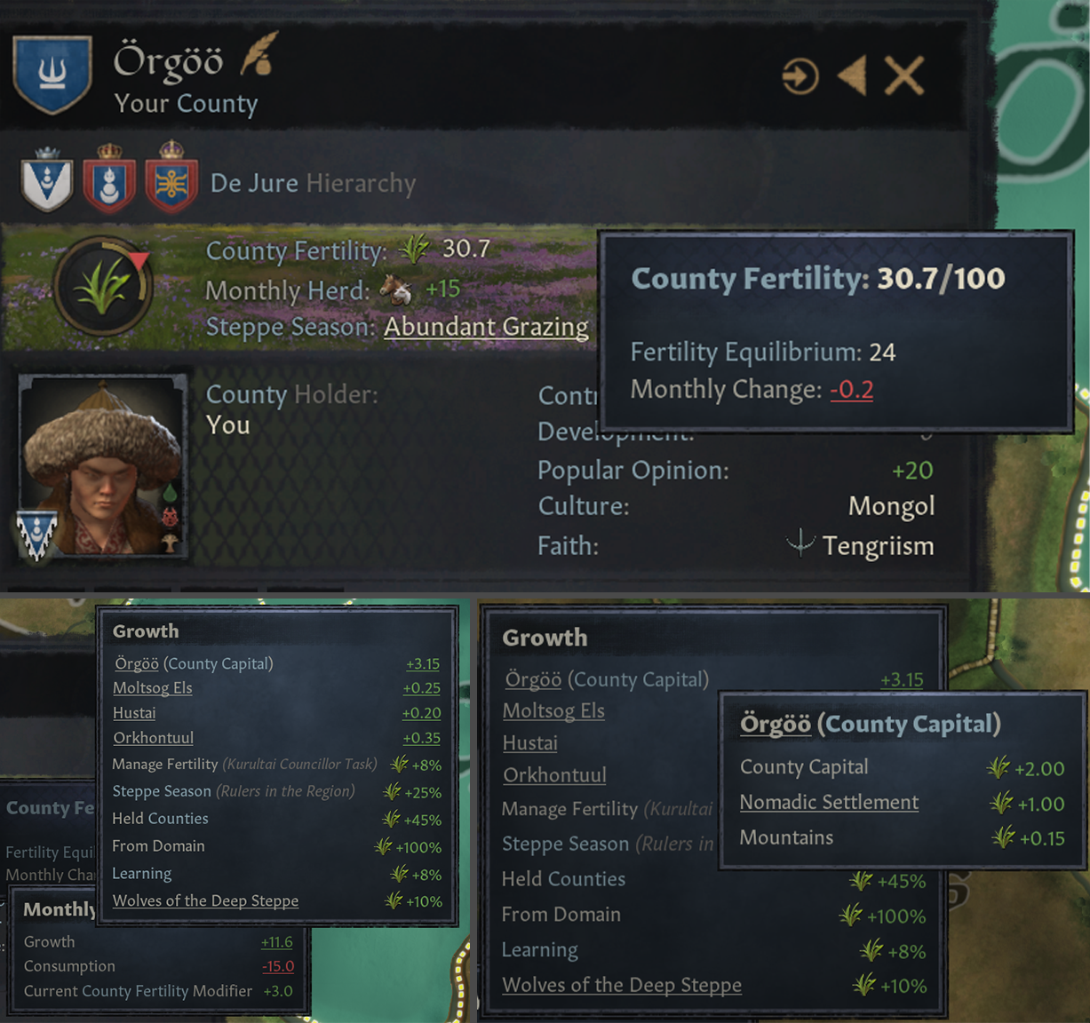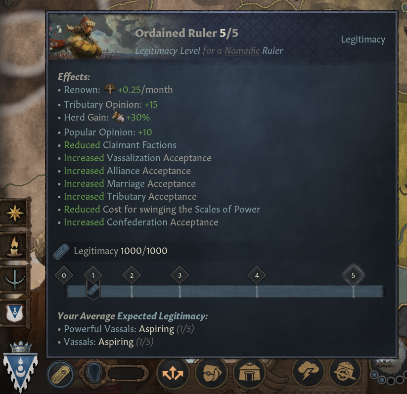 -유목정은 지배력 단계에 따라 고정된 최소/최대 직할령 한계&봉신 한계를 가짐: 이 한계들은 지배력, 유르트 건물을 통해서만 높일 수 있으며, 인물 능력치나 인생관 특성으로 얻지 못 함