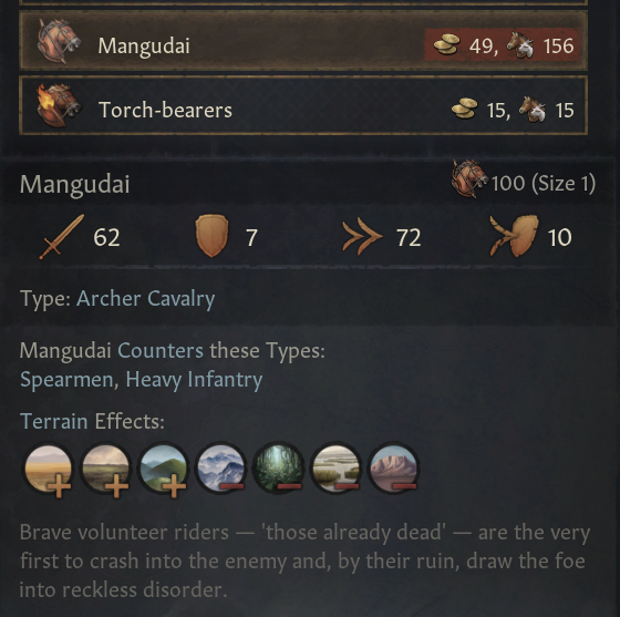 (6) 백색 조드: 눈이 방목지에 쌓였을 때 발생. 가축들이 풀을 먹는게 불가능. 비옥도 소모 +40%. 보복 전쟁 명분 무료(조공국 지역으로 왔으나, 조공 거부 시 주어짐). 기수를 더 나은 무장병으로 전환 비용 -25%, 보급 한계 -20%