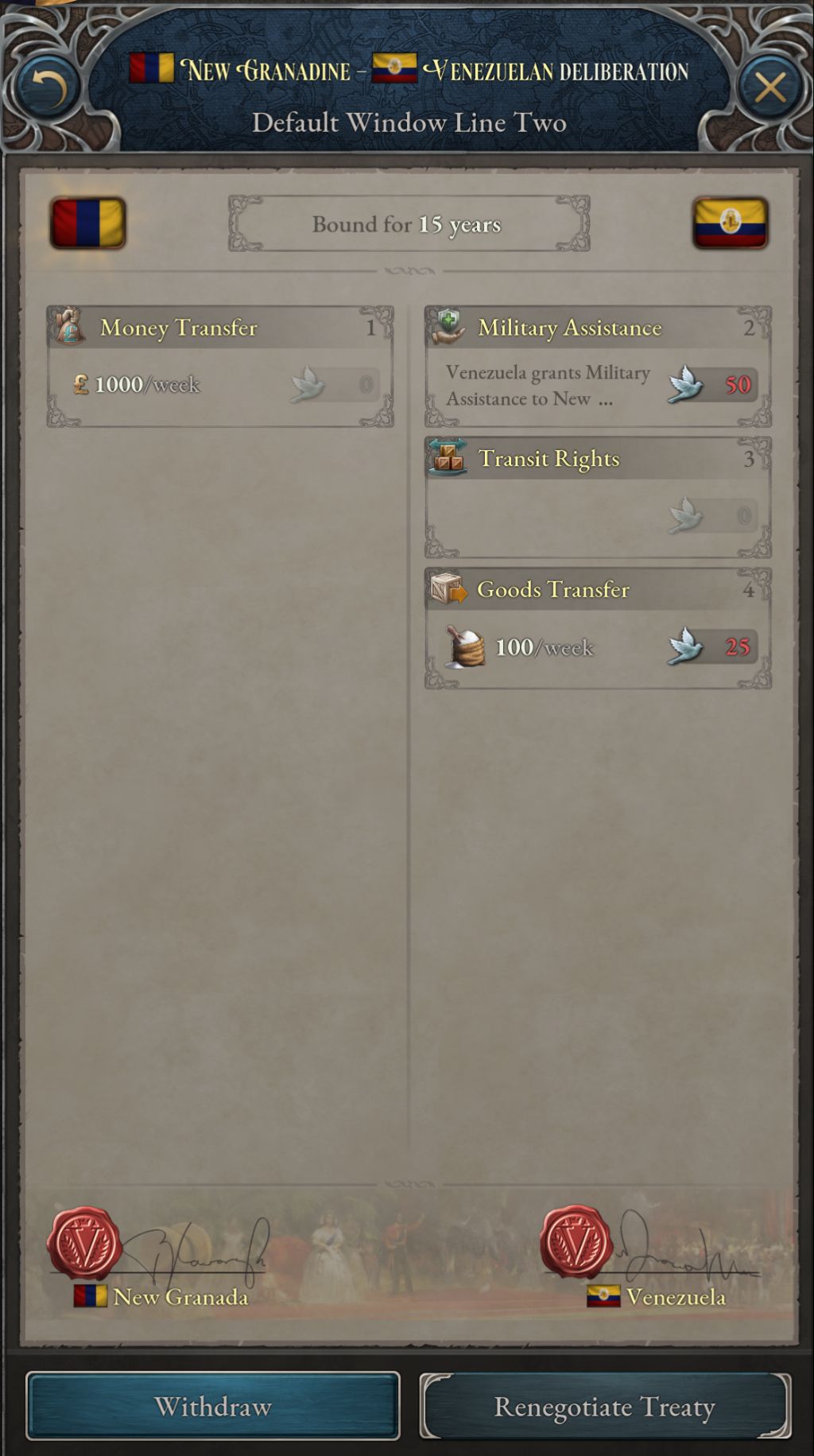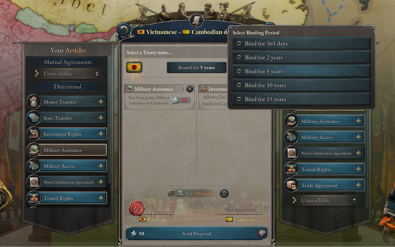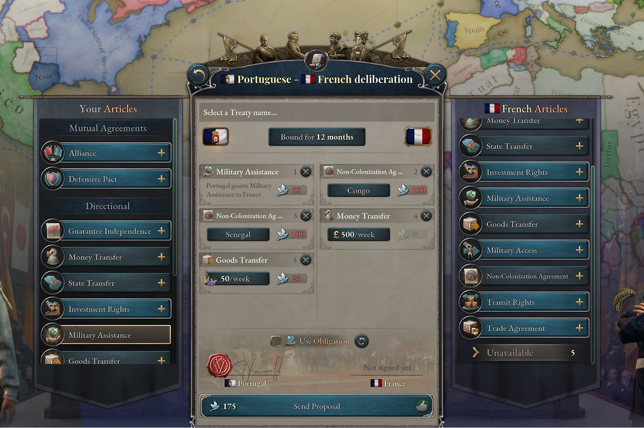 요약: 앞으로 동맹을 맺거나 군통권을 받거나 보조금을 주고받거나 하는 모든 외교 행동은 조약이라는 시스템으로 대신됩니다. 조약이라는 것은 그림들과 같이 '내가 ~~를 제공하는 대신 너가 ~~를 제공해 줘'하는 시스템입니다. 무역 상품을 주고받는 것 역시 조약 시스템으로 포함됩니다. 조약의 조항 중에는 조약항이나 투자권 등이 있으며 이것들은 전쟁으로 강요할 수 있습니다.