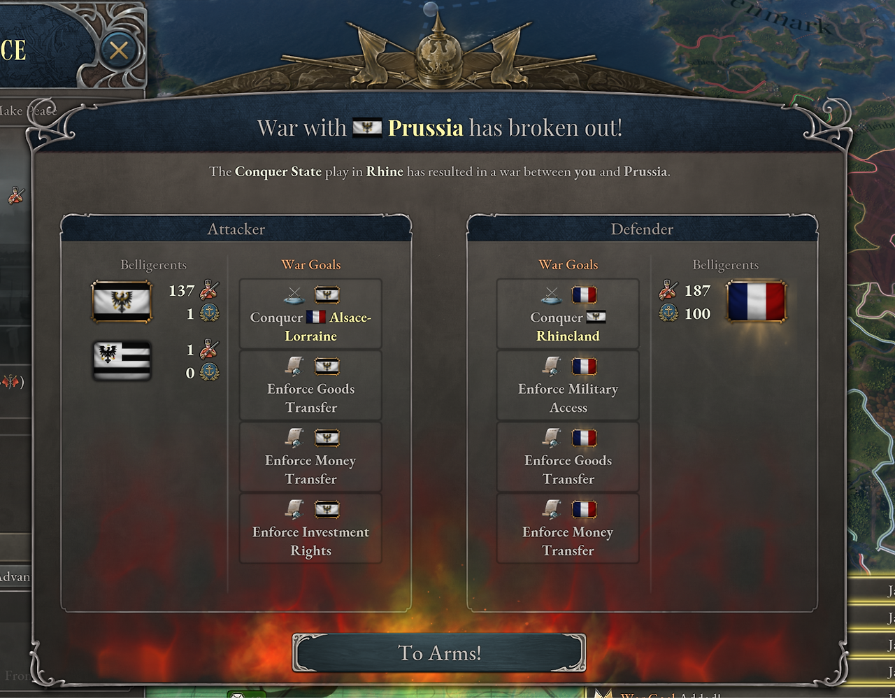 [프로이센 측 전쟁목표: '알자스 로렌 정복', '상품 제공 강요', '돈 제공 강요', '투자권 강요' / 프랑스 측 전쟁목표: '라인란트 정복' '군사 통행권 강요' ' 상품 제공 강요', '돈 제공 강요']