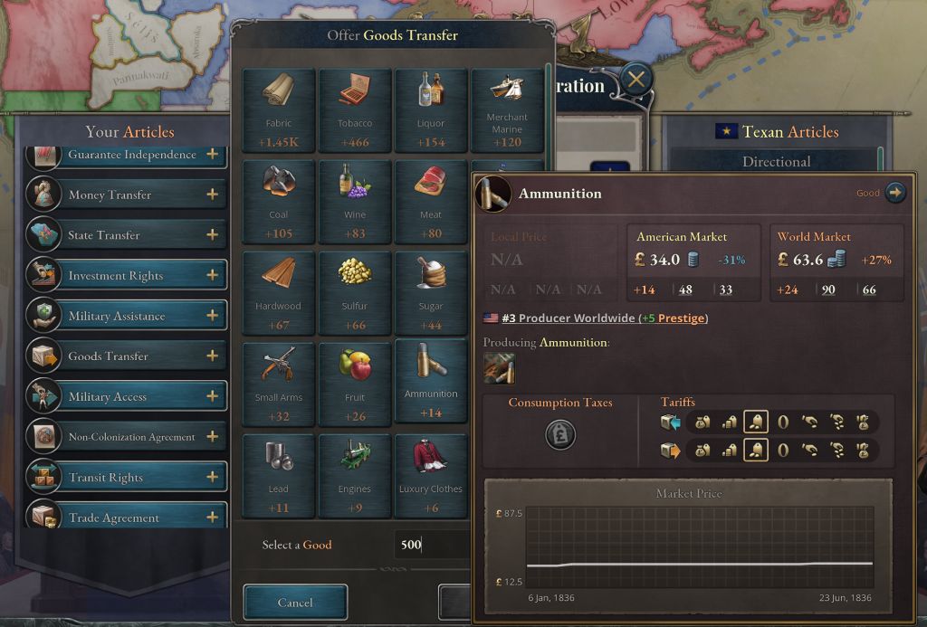 예를 들어 벨기에를 플레이하는데 종이를 만들기 귀찮아서, 네덜란드에 유황을 주는 대신 종이를 받아오는 조약을 체결했다고 가정합시다. 그런데 네덜란드가 종이 공장이 있는 지역을 죄다 빼앗겨서 종이 품귀가 발생했고, 조약을 지키지 못했습니다.