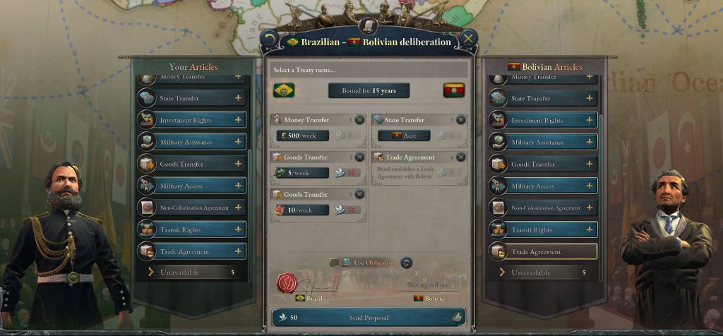 각 국가는 자신이 주고 싶은 것을 고르고, 그 대가로 상대방에게 얻고 싶은 것을 골라서 협정을 제안할 수 있습니다. 협정을 제안받은 국가는 수락할 수도 있고, 아니면 몇몇 조항을 고쳐서 다시 역제안할 수도 있습니다. 어느 한 쪽이 수락하거나 거부할 때까지 계속됩니다.