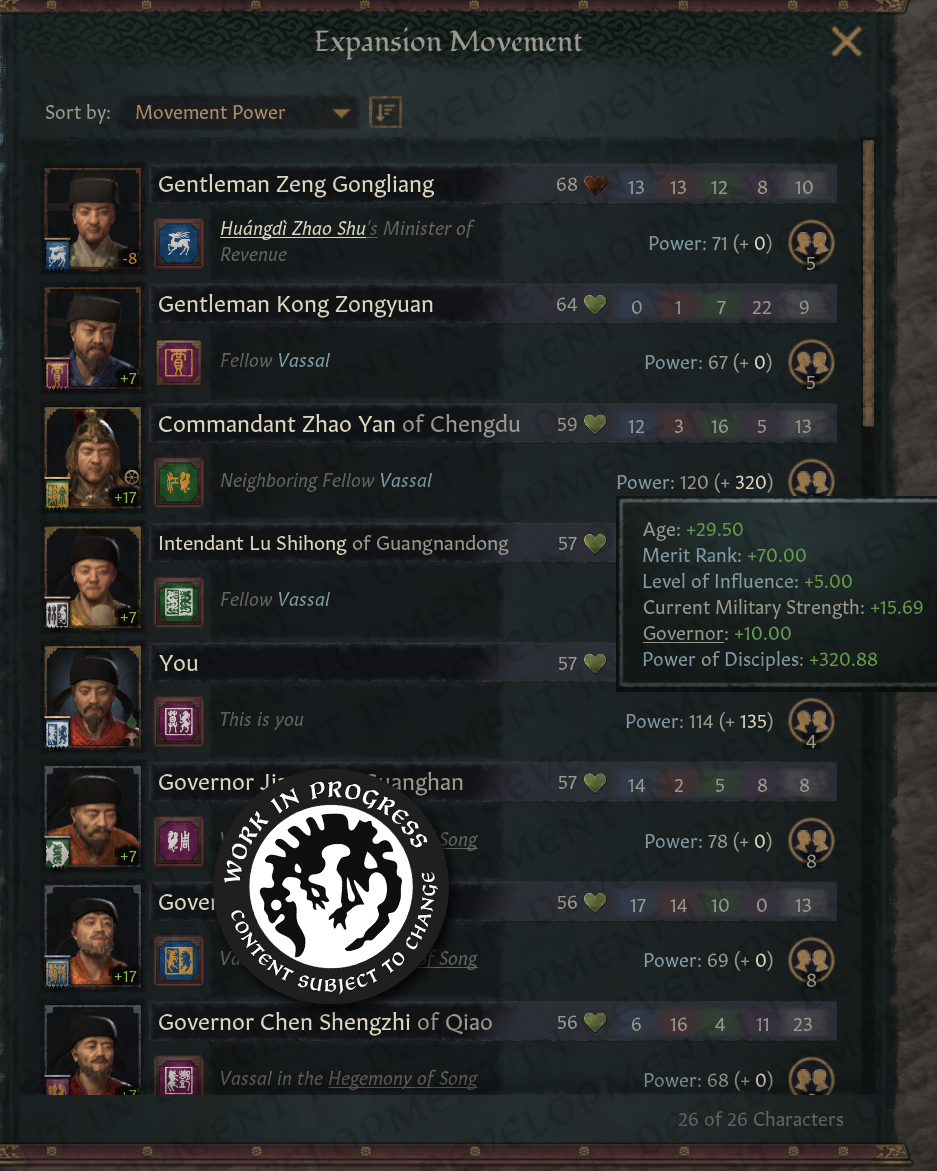 등 각 파벌에 속한 가신들이 상호작용을 하며, 왕조 주기에도 영향을 끼치는데 일지에선 1066년 시점으로부터 얼마 후에 일어난 왕안석의 신법파와 사마광의 구법파 간 논쟁을 예시로 제시하고 있음. 둘 다 역사적으로 1066년 시점에서 생존 중