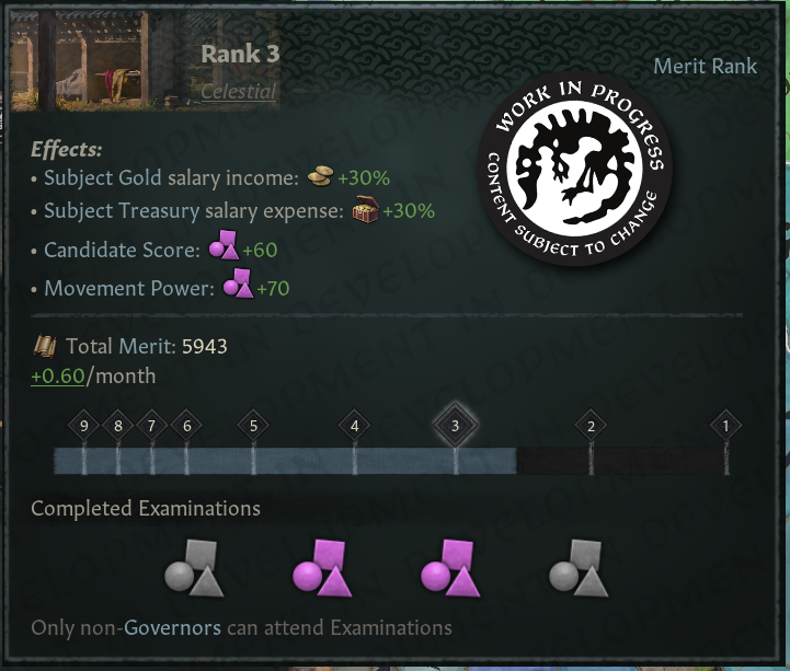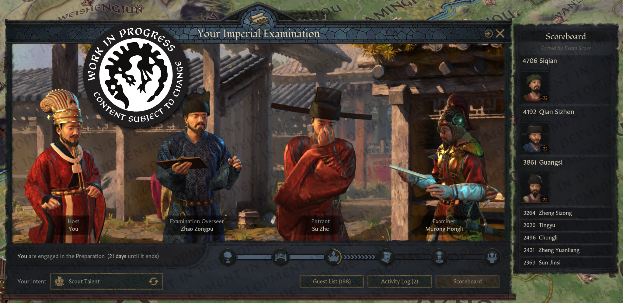 시험 순서는 동시(게임에서는 6세부터 응시 가능)→향시(결단으로 표시. 합격 시 현령으로 임명 가능성 있음)→회시(수도에서 향시 합격자를 대상으로 실시)→전시(회시 합격자 중 상위권만 응시 가능. 황제가 감독하며 실제 역사에선 합격자 전원에게는 진사, 1위는 장원, 2위는 방안, 3위는 탐화가 됨)순서로 진행되며 합격하려면 유교 지식을 충분히 익혀야 하며, 인맥 등 우회적인 방법으로도 가능하다고 일지에서 언급됨