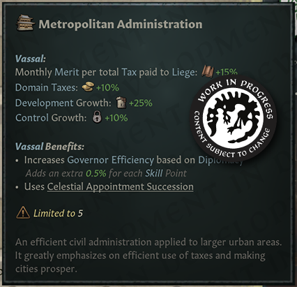 대도시 지구는 개발도와 장악력, 세금 수입에 특화되며 수가 제한됨. 또한 왕조 주기가 성장기일 때만 활성화 가능