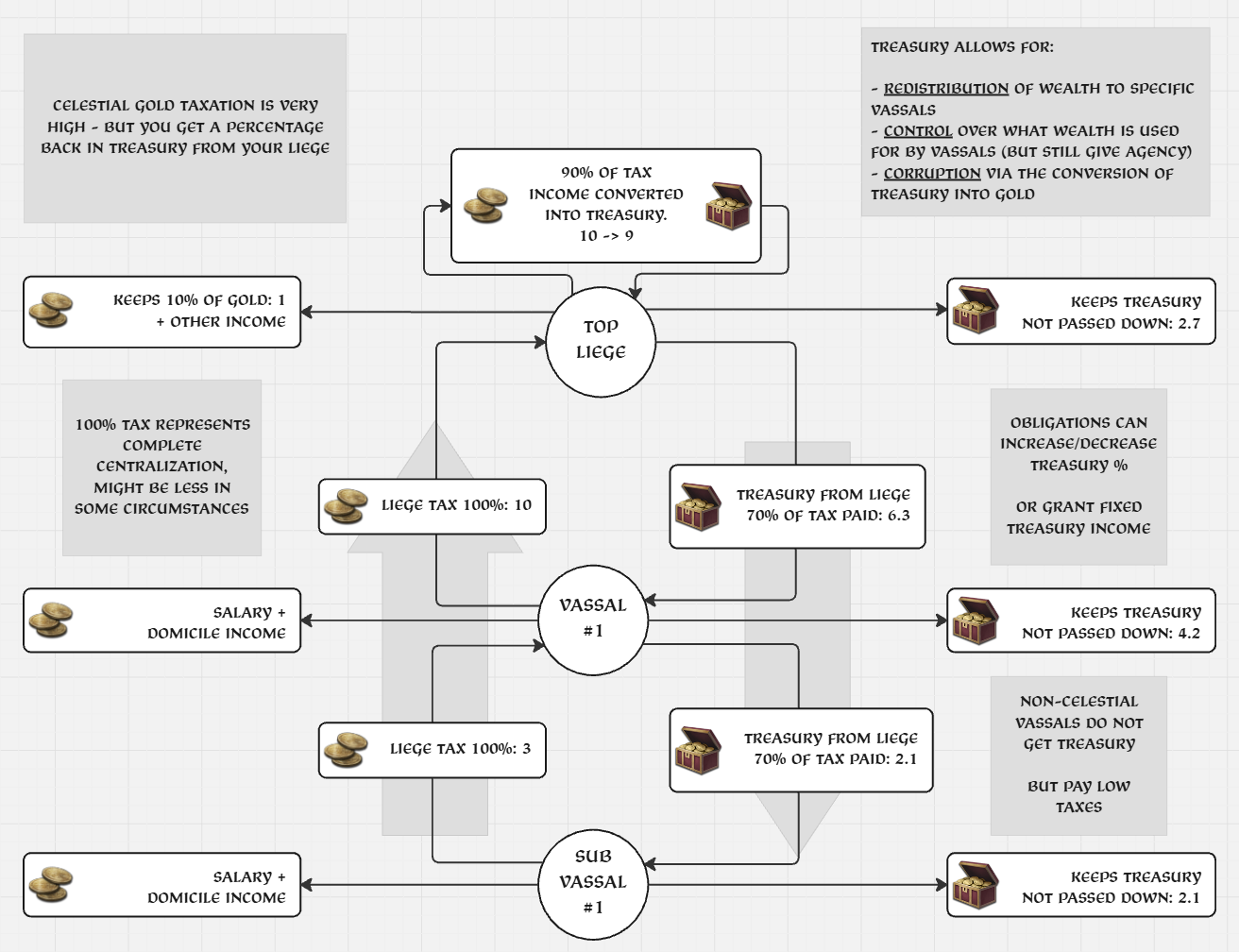 3) 그런 다음 황제는 각 총독(가신)이 징수한 세금과 그들이 다스리는 직함에 따른 조정 금액을 기준으로 모든 총독(가신)에게 재정을 내립니다. 이 가신들은 다시 하위 가신들에게 재정을 내립니다. 이는 중앙 정부로부터 징수한 세금보다 더 많은 재정을 받을 수 있음을 의미합니다. 예를 들어, 황량한 사막 지대에 있는 보호령 국경 순찰대의 군사 총독은 상당한 규모의 군대를 유지해야 하므로 더 많은 재정을 받을 수 있습니다.
