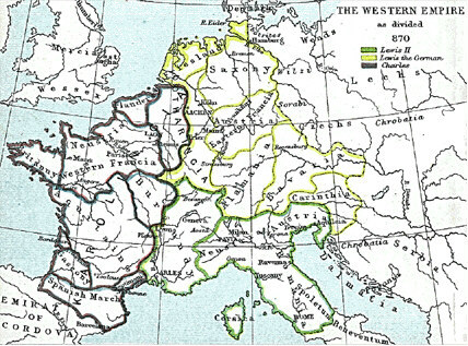 위대한 카롤루스 마그누스 사후 그의 생존한 유일한 아들이였던 루이 경건제가 제국을 다스렸지만. 생전부터 시작된 아들 3형제의 치열한 내전으로 제국을 간신히 유지했고 843년 베르됭조약으로 서로 갈라먹었고 그뒤 870년 메르센조약으로 로타링기아를 갈라먹으면서 완전히 해체된 상황이였습니다
