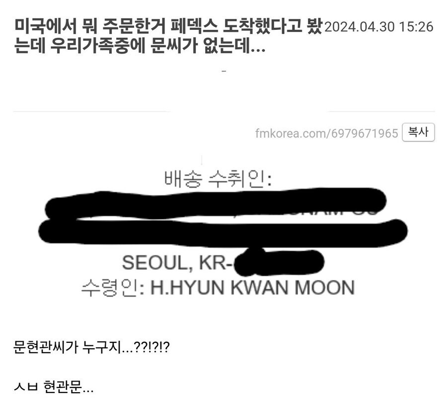모르는 사람 이름으로 온 해외 배송 작성자Khrome|작성시간24.07.21|조회수529 목록 댓글 3 글자크기 작게가 글자크기 크게가 현관문 : 아아, 수령했다. 다음검색 현재 게시글 추가 기능 열기 북마크 공유하기 신고 센터로 신고 댓글 댓글 3 댓글쓰기 답글쓰기 댓글 리스트 작성자ACrookedMan | 작성시간 24.07.21 ㈜현관문 (법인) 작성자황초롱이 | 작성시간 24.07.22 엌 ㅋㅋㅋㅋㅋㅋㅋㅋㅋ 작성자AntiAnt | 작성시간 24.07.23 요즘은 현관문도 배송을 시키네 댓글 전체보기