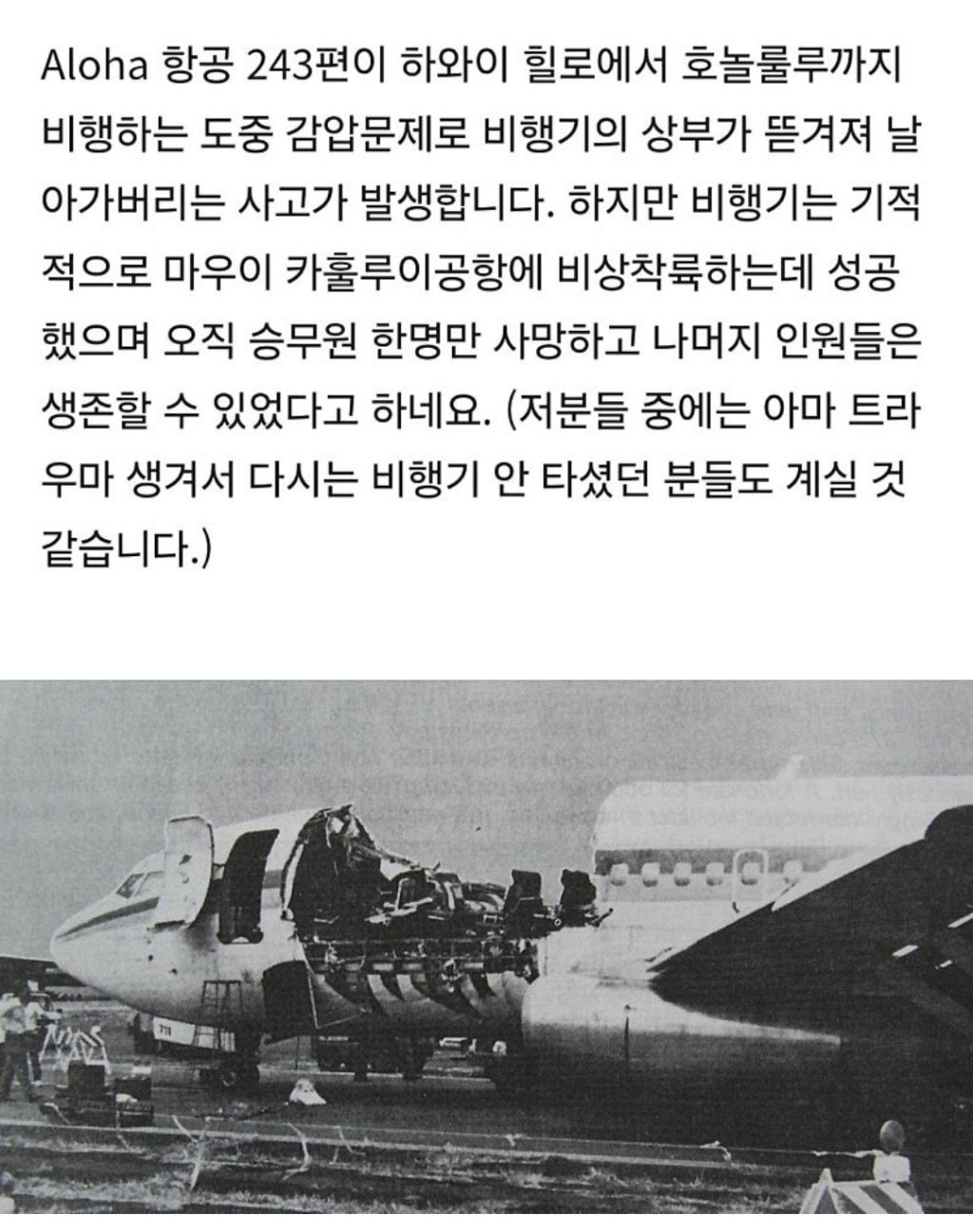[스크랩] 실제 일어난 항공기 사고 작성자황초롱이|작성시간24.08.18|조회수533 목록 댓글 2 글자크기 작게가 글자크기 크게가 승무원 1명은 바다에 빠져 사망사망자 승무원 다음검색 스크랩 원문 : 이종격투기 현재 게시글 추가 기능 열기 북마크 공유하기 신고 센터로 신고 댓글 댓글 2 댓글쓰기 답글쓰기 댓글 리스트 작성자훑(orthodox) | 작성시간 24.08.18 생전 개쩌는 경험이라 평생 썰풀었을듯 생존자면 작성자AUSTRIA STRONK | 작성시간 24.08.21 진짜무섭네 댓글 전체보기
