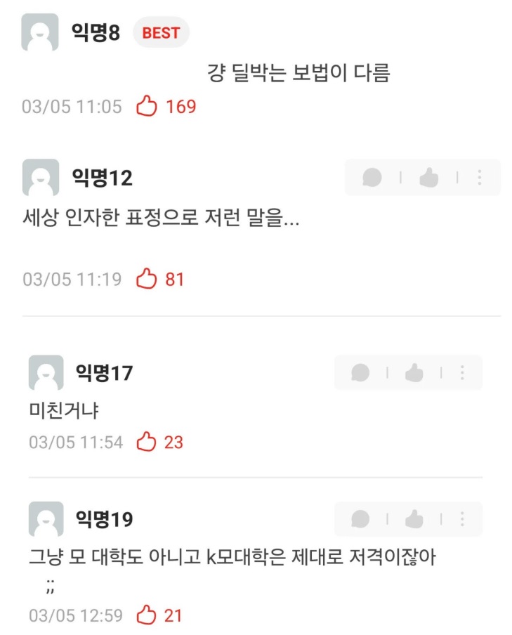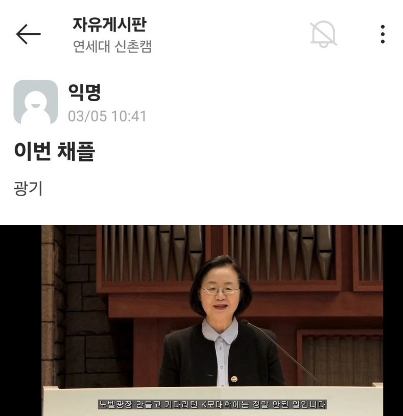 광기의 연대 채플 시간 작성자안녕_|작성시간25.03.06|조회수555 목록 댓글 4 글자크기 작게가 글자크기 크게가 다음검색 현재 게시글 추가 기능 열기 북마크 공유하기 신고 센터로 신고 댓글 댓글 4 댓글쓰기 답글쓰기 댓글 리스트 작성자차들어 홍차야 | 작성시간 25.03.06 작성자통장 | 작성시간 25.03.06 "수준 이하면 언급도 안했다" 작성자매화의성 | 작성시간 25.03.07 내가 K대학에 대한 애정은 전혀 없지만니놈들이 그런 소리 하는건 참아줄 수 가 없다!!!! 작성자크로노페르 | 작성시간 25.03.07 하… 분하네요 댓글 전체보기