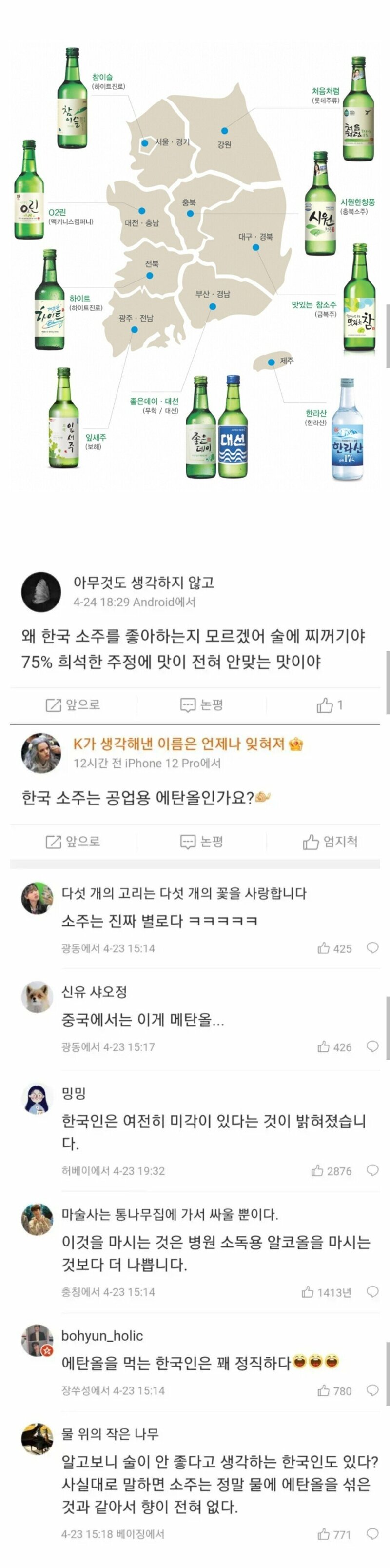 희석식소주라는 게 말그대로 물에 주정 넣고 감미료 탄 거라서 전통주에 비해 훨씬 싸고 맛없긴 한데... 중국인들이 욕할 입장은 아닌듯! 고량주랍시고 물에 주정넣고 아세톤향 첨가해서 억지로 농향고량주 흉내내는 건 뭔데?