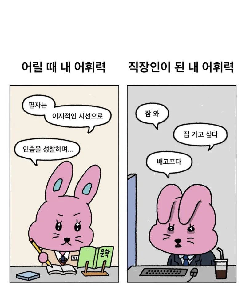[스크랩] 학생 때의 나와 직장인 나와의 어휘 차이 작성자황초롱이|작성시간25.03.15|조회수470 목록 댓글 5 글자크기 작게가 글자크기 크게가 다음검색 스크랩 원문 : 樂soccer 현재 게시글 추가 기능 열기 북마크 공유하기 신고 센터로 신고 댓글 댓글 5 댓글쓰기 답글쓰기 댓글 리스트 작성자모바일 | 작성시간 25.03.15 슬퍼요... 작성자다르파 | 작성시간 25.03.15 귀가 쳐졌어ㅠ 작성자통장 | 작성시간 25.03.15 저렇게 고이 아껴둔 집중력을 보고서에 사용해도 퇴짜맞기 때문이지요(..) 작성자매화의성 | 작성시간 25.03.15 졸업한지 20년 가까운데 대학 다닐때 보다 어휘력이 더 떨어진거 같아요... 작성자유기체말살시스템 합성체 | 작성시간 25.03.16 에뷰뷰뷰뷰 으뷰에뷰 에뷰으뷰 뷰뷰뷰ㄸㅍ 댓글 전체보기