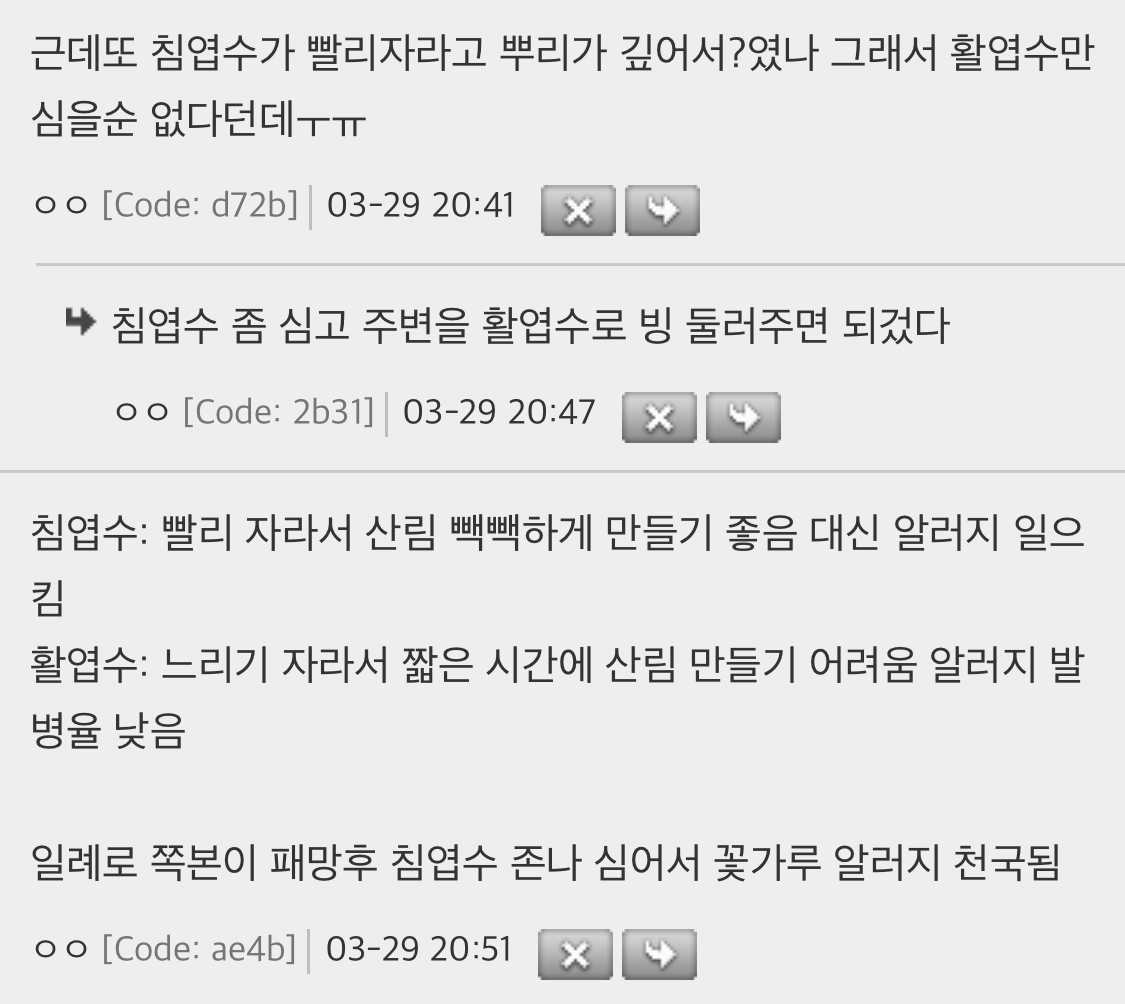 침엽수는 뿌리가 튼튼하고 깊게 내리고 활엽수는 뿌리가 깊게 못내려가서
