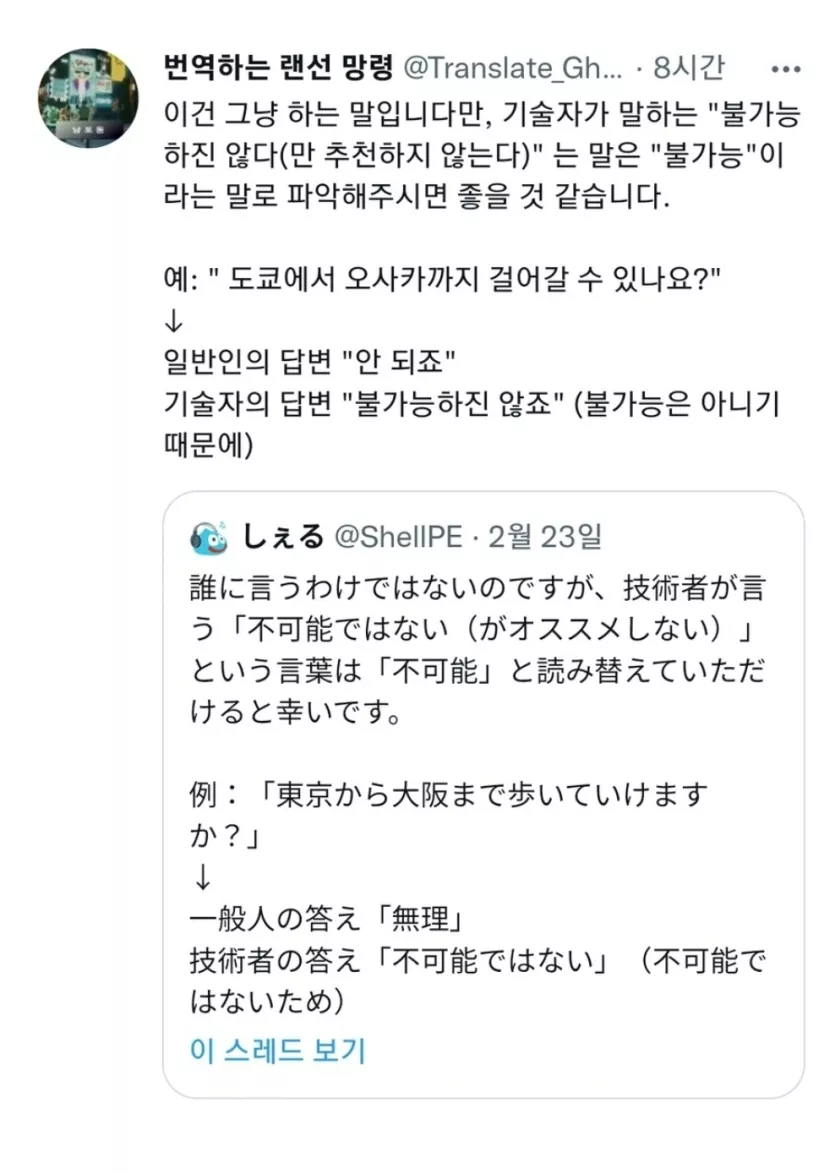 기술자가 말하는 '불가능하진 않다'의 의미 작성자갓겜빅토3|작성시간25.05.16|조회수601 목록 댓글 4 글자크기 작게가 글자크기 크게가 다음검색 현재 게시글 추가 기능 열기 북마크 공유하기 신고 센터로 신고 댓글 댓글 4 댓글쓰기 답글쓰기 댓글 리스트 작성자루드비히 베크 | 작성시간 25.05.16 역시 나는 불가능을가능하게.. 작성자눈사람no.2 | 작성시간 25.05.16 이과식 발언 ㅋㅋㅋ 작성자매화의성 | 작성시간 25.05.16 영업에서는 저걸 가능하다고 합니다... 작성자모바일 | 작성시간 25.05.16 저에게 시간과 예산을 더 주신다면... 댓글 전체보기