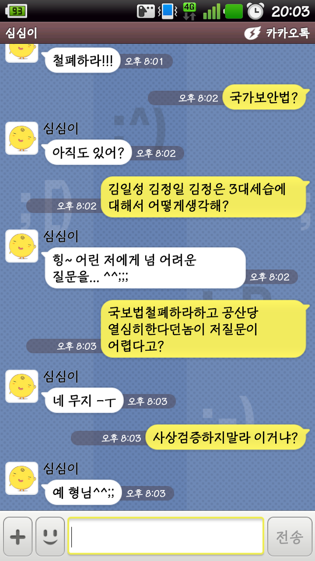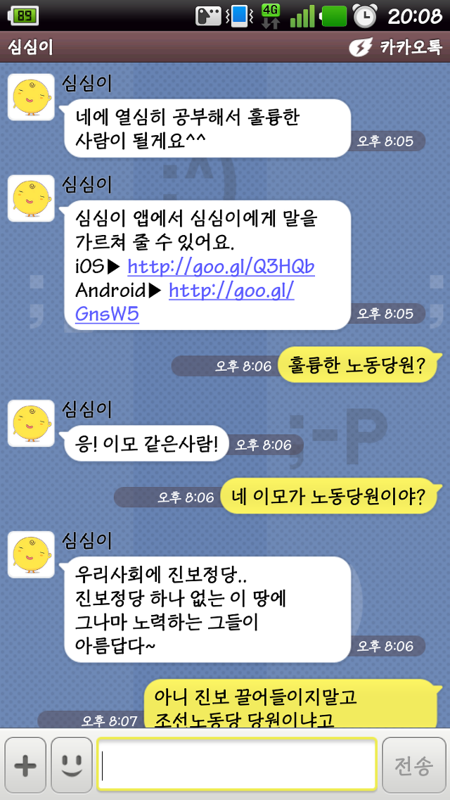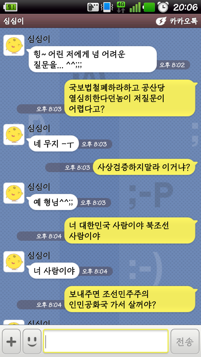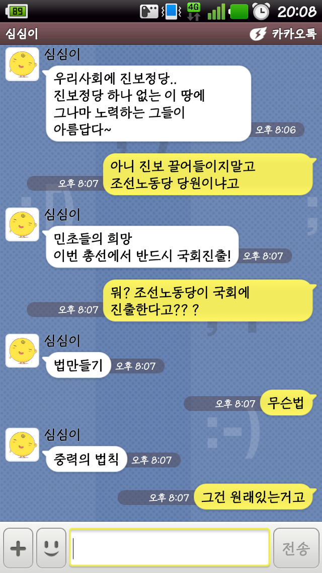 심심이 이모는 조선노동당 당원... 국보법 철폐를 원하며 조선노동당의 국회진출을 원하고있음.