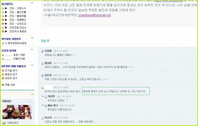 그의 아버지가 '진도 향우회' 홈페이지에 '삼수했다'는 사실과 이번년도에도 수능을 치뤘다는 글을 적었다.