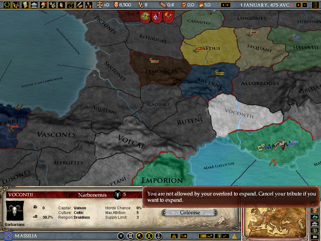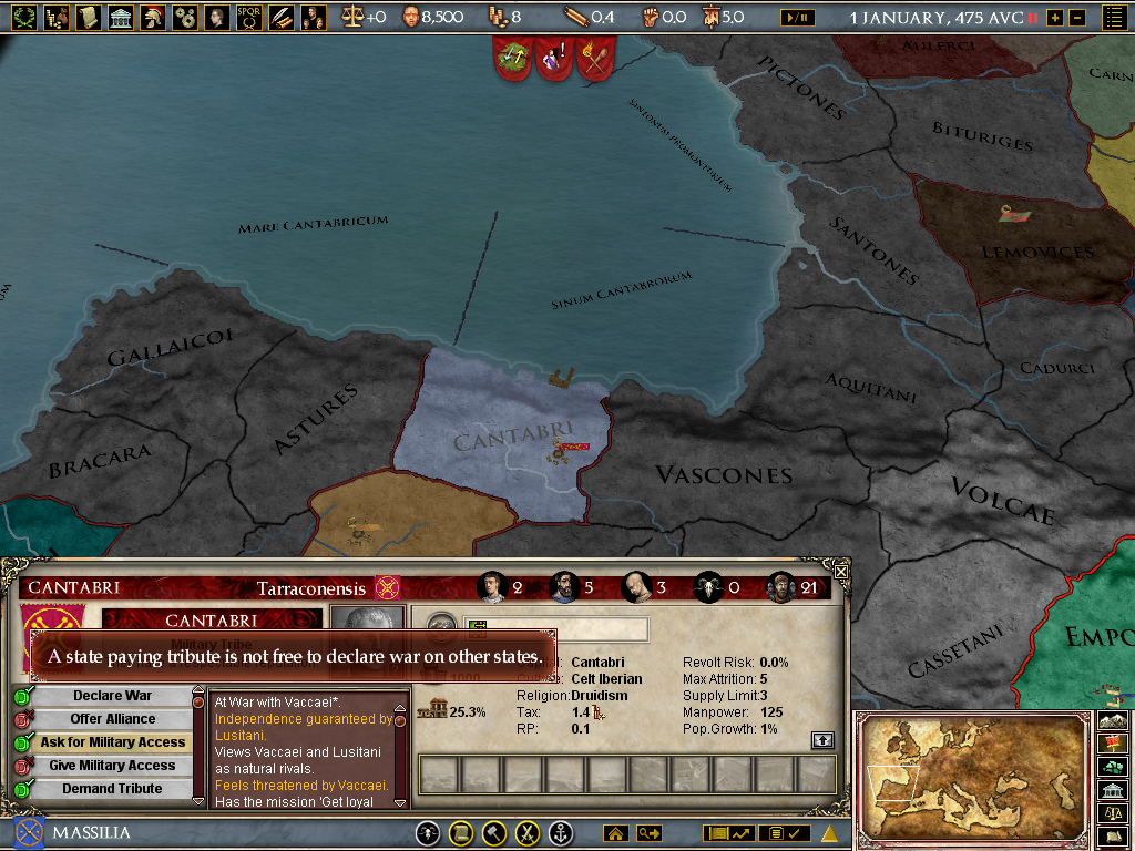 위 스샷은 Massilia인데, 이처럼 조공을 바치는 나라는 타국에 전쟁 선포를 할 수 없으며,