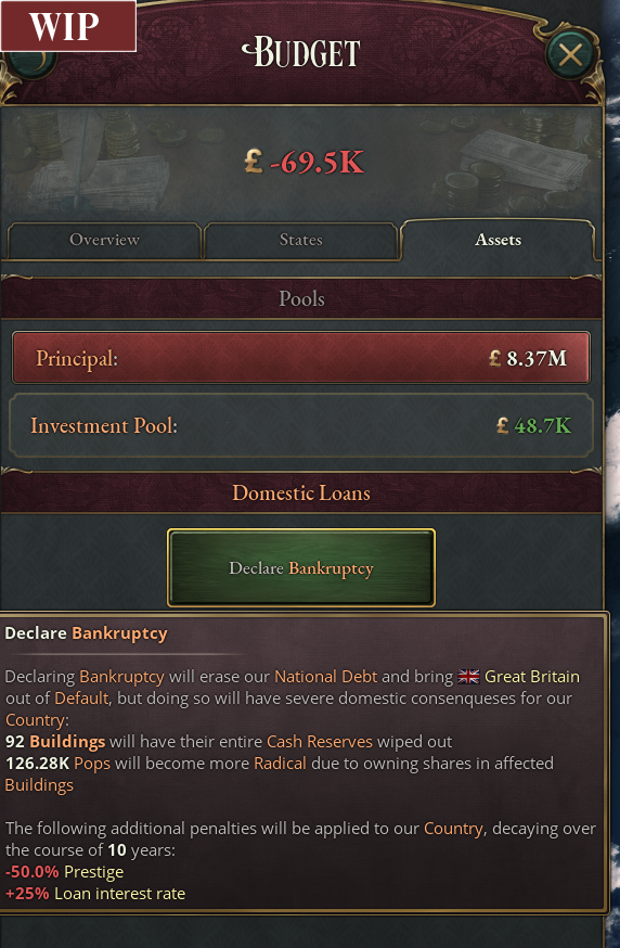 재정 상태가 심각하게 악화될 경우 '파산 선언하기' 버튼이 활성화됨. 파산 신청을 할 경우 당장은 살아 날 수 있겠지만. 여러가지 불이익이 있을 것임/ 현재 사진에서 파산을 하게 될 경우 92개의 건물의 보유 자산을 싸그리 날려버리고, 12만6천280여명의 팝들이 더욱 급진적으로 변할것임. 그리고 국가 전체적으로는 10년동안 50%의 위신이 감소하고 국제대출의 금리가 25%가 인상될 것임/
