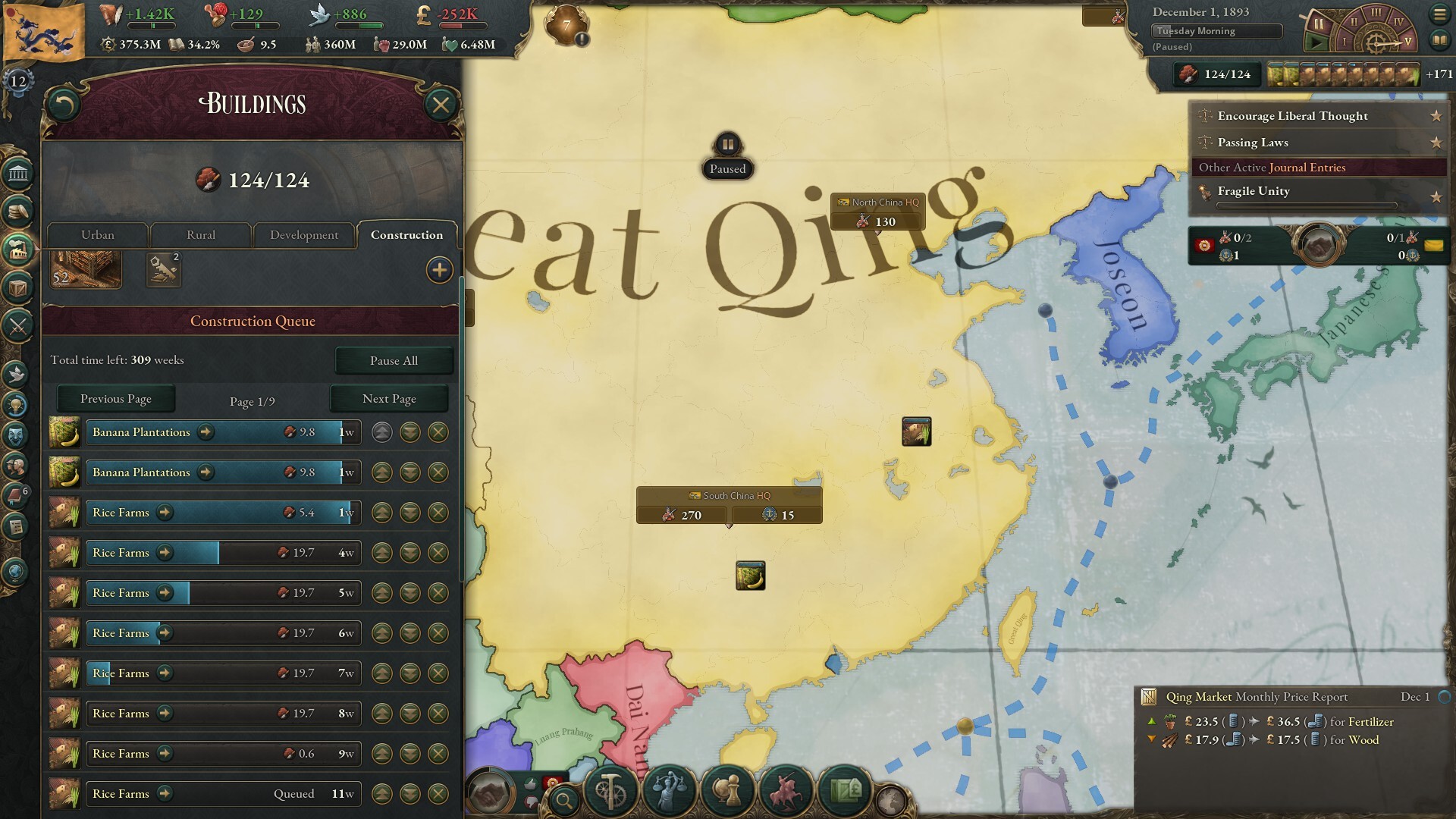 내정 개발 이외에 인상적인 부분이었다면 저널 시스템이었습니다. 별로 언급이 안되는 컨텐츠지만 저널 시스템은 후기 EU4와 임롬 식의 고정된 미션 트리를 벗어나서 초기 EU4의 미션처럼 국가 특성 목표와 범용 목표 같은 이런저런 목표들을 던져줘서 플레이어에게 자유도를 제공하고 디시전과 분리해서 디시전에 너무 많은 것이 몰빵되는 상황을 개선한 점은 꽤 탁월한 선택이었다고 생각합니다. 현재 바닐라에서의 활용도를 보면...좀 애매한 편이지만 청나라에서 EU4의 재앙 진행도와 비슷하게 다루는 것도 가능한 것을 보면 유저 모드로 활용하면 사용법이 무궁무진할 듯합니다.
