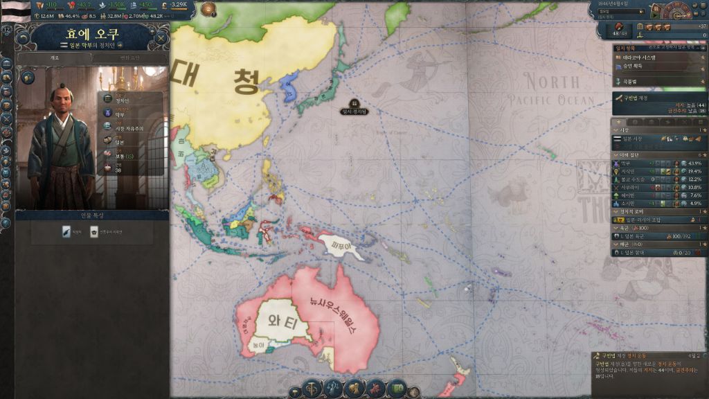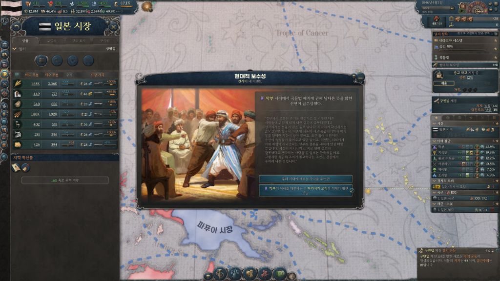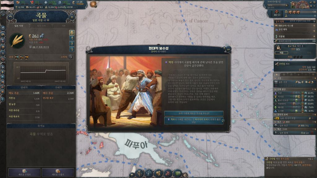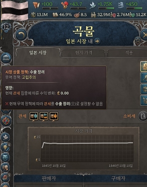일본도 비슷하게 어떻게든 자유무역을 뚫고 곡물법을 띄우려고 했는데...이상하게도 고립주의인데도 불구하고 무역 탭은 자유무역 판정을 받는지는 몰라도, 곡물 가격이 급등하니 바로 곡물법이 나타났습니다. 한번도 이런 경우를 못봐서 버그로 생각되는데...꽤나 개꿀인 부분입니다
