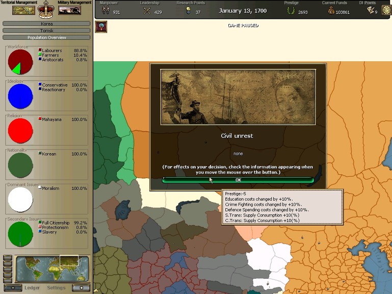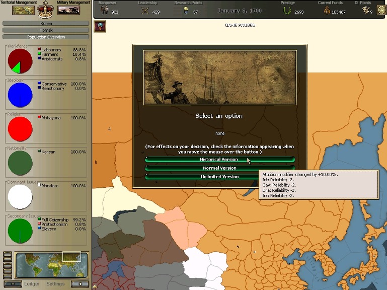 게임의 형식은 '빅토리아 : 혁명'이며 모드로 Europa Victoria Modification 1.02를 채택하였습니다.
