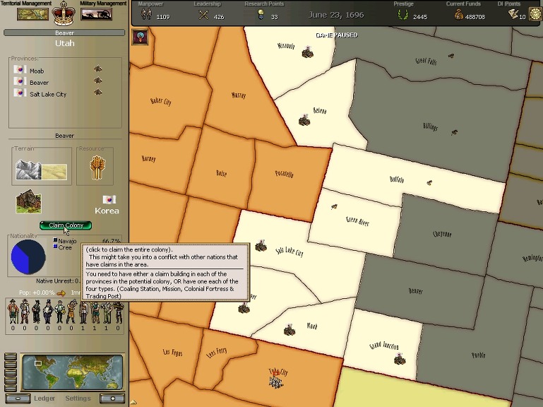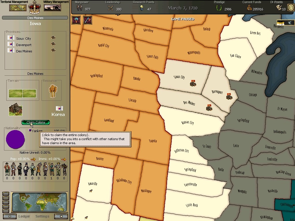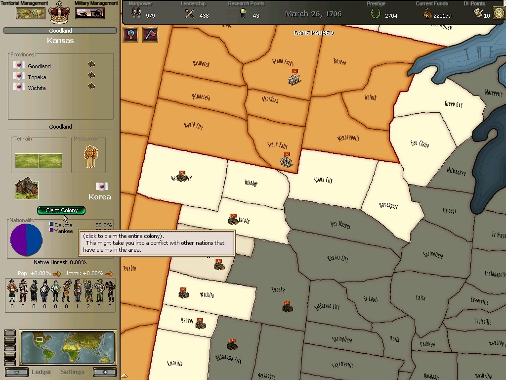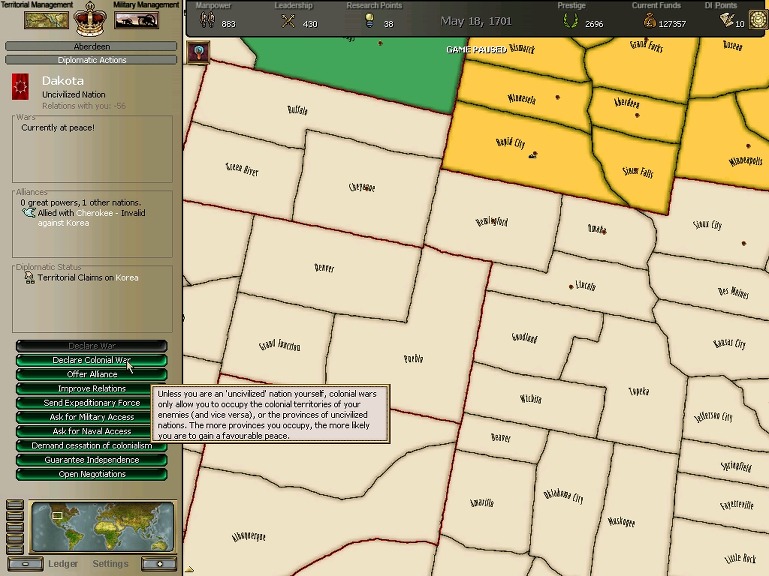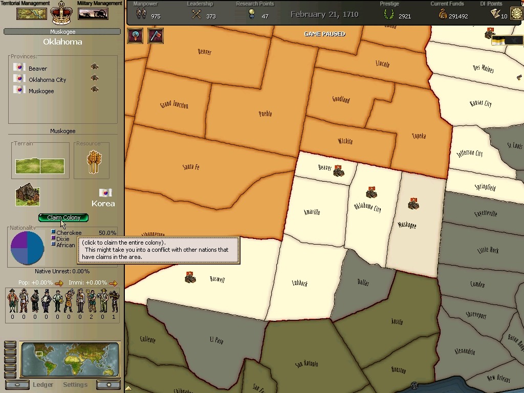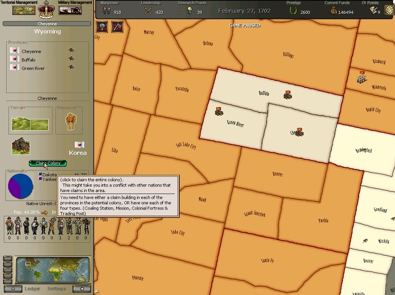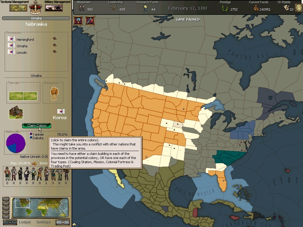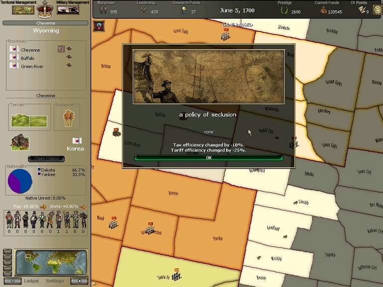 * 네브레스카도 넘어왔구요. 영국과의 교섭이 성사되어 동부의 개척도 호조를 보이고 있습니다.