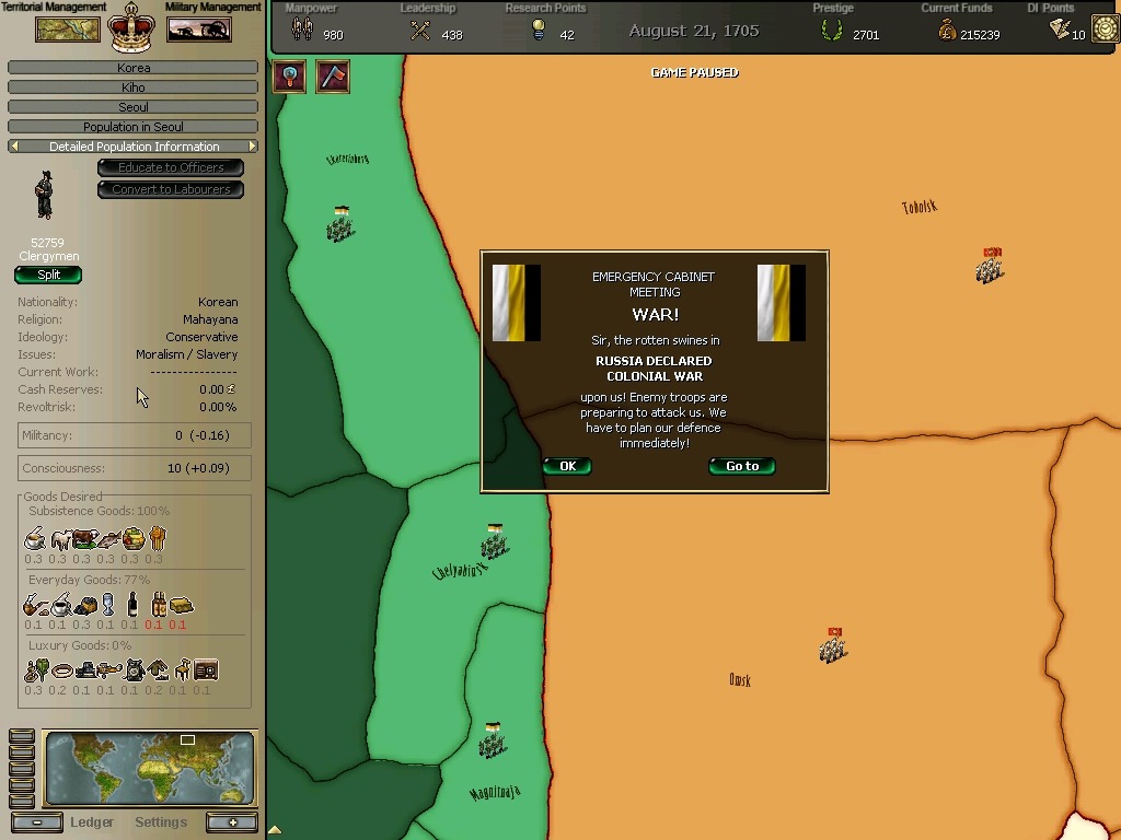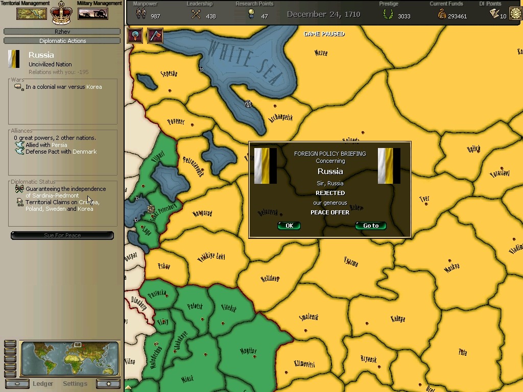 그러나 이때문에 노서아왕국과 대치전을 야기하게된다.