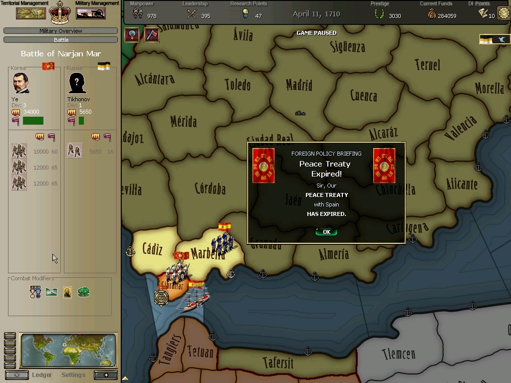 한창전쟁하는 와중에 서반아왕국과의 평화기간조약이 종결되었다.