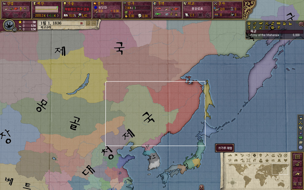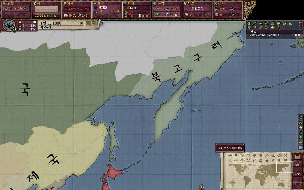 이 소설이 배경이 1800+몇십년 정도였고, 한국군들이 캄차카반도에 나라를 세우고, 사할린에는 외국 민간인을 격리 한다는 설정이었던걸로 기억해서 시작할때의 영토는 저정도로 잡을거고, 미국이 태평양 연안까지 코어 생기게 하는 이벤트로 영역을 넓혀볼 생각